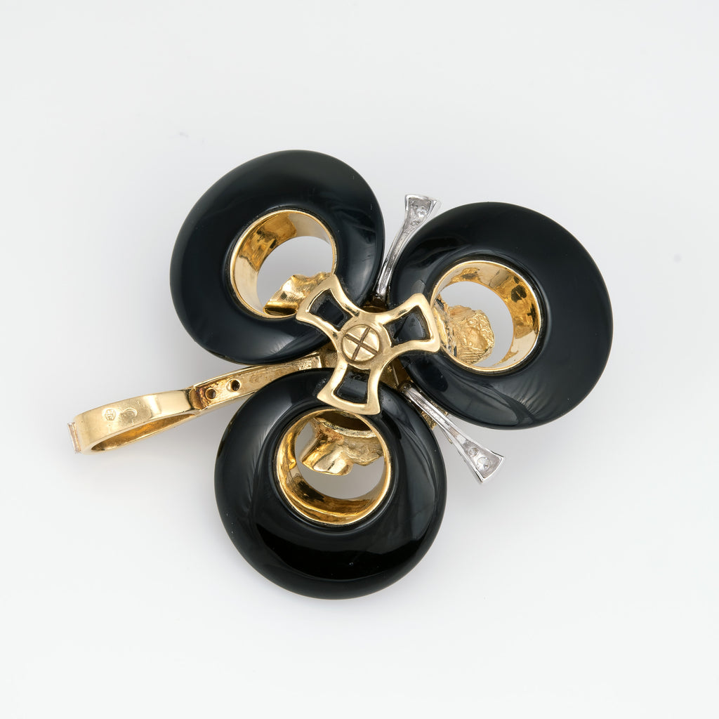The beautifully detailed leopard is framed in an elaborate onyx mount. Black enameled spots give lifelike detail to the leopard with rubies set to the eyes. Measuring 2 inches in length the leopard makes a great statement when worn.