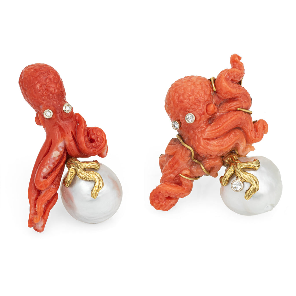 Definitely a unique pair of earrings, natural salmon hued coral is carved in the form of an Octopus. The carved pieces of coral are different making for a truly one-of-a-kind pair of earrings that will not go unnoticed! Large baroque pearls are set to the base with diamond set eyes to each Octopus. The earrings are large in scale and make for a great statement for day or evening wear. You will never see another pair of earrings quite like these beauties!