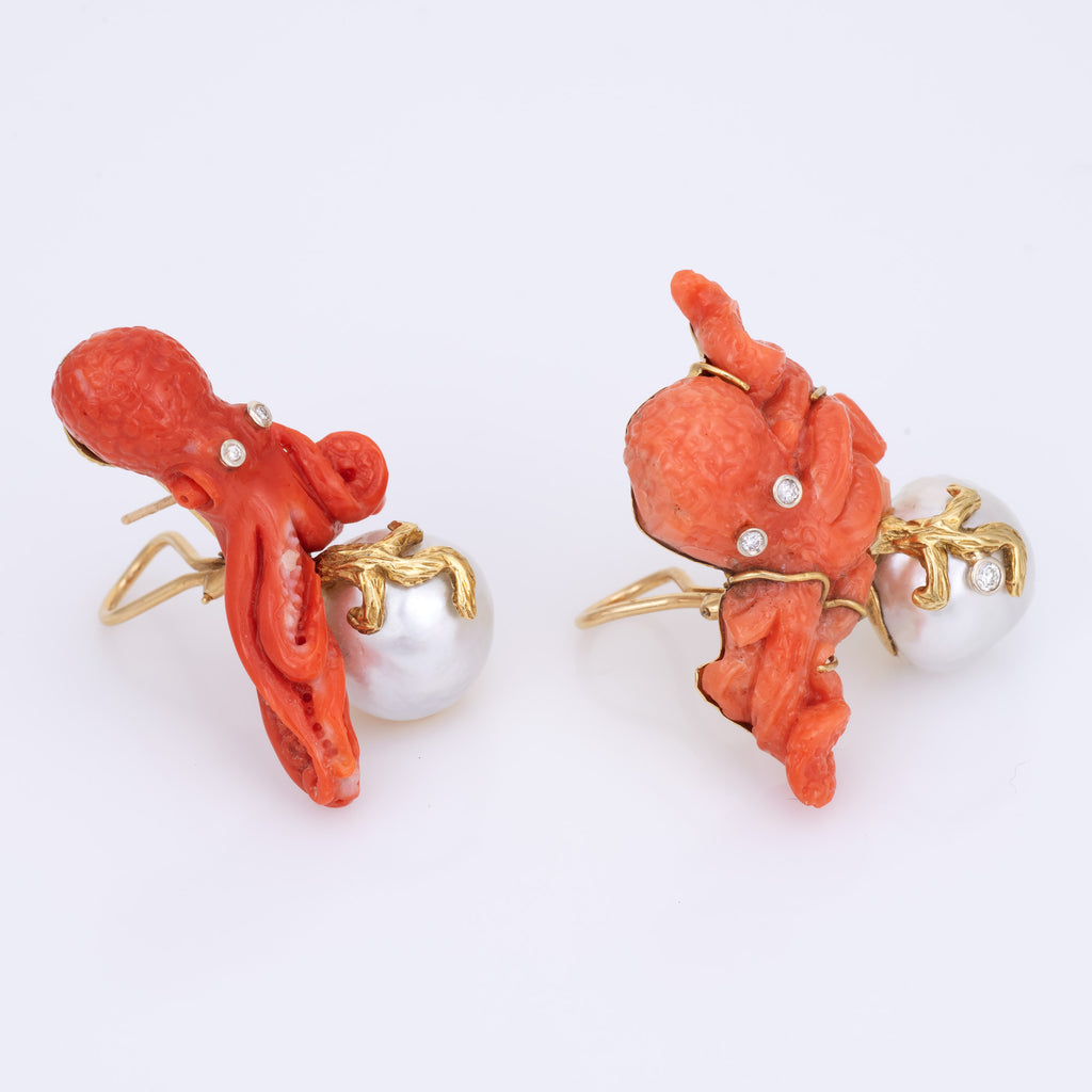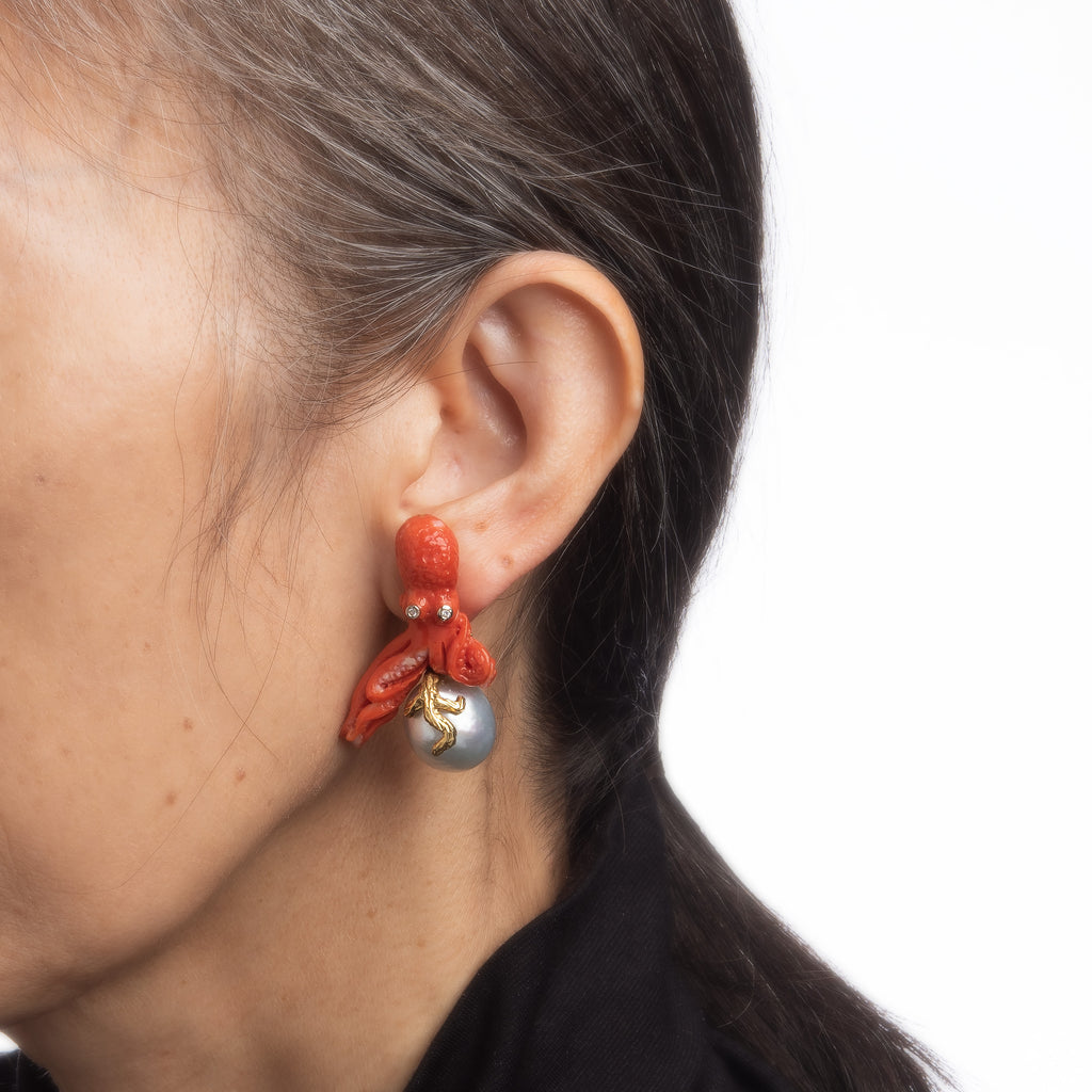 Distinct and unique carved coral, pearl & diamond Octopus earrings crafted in 18k yellow gold.