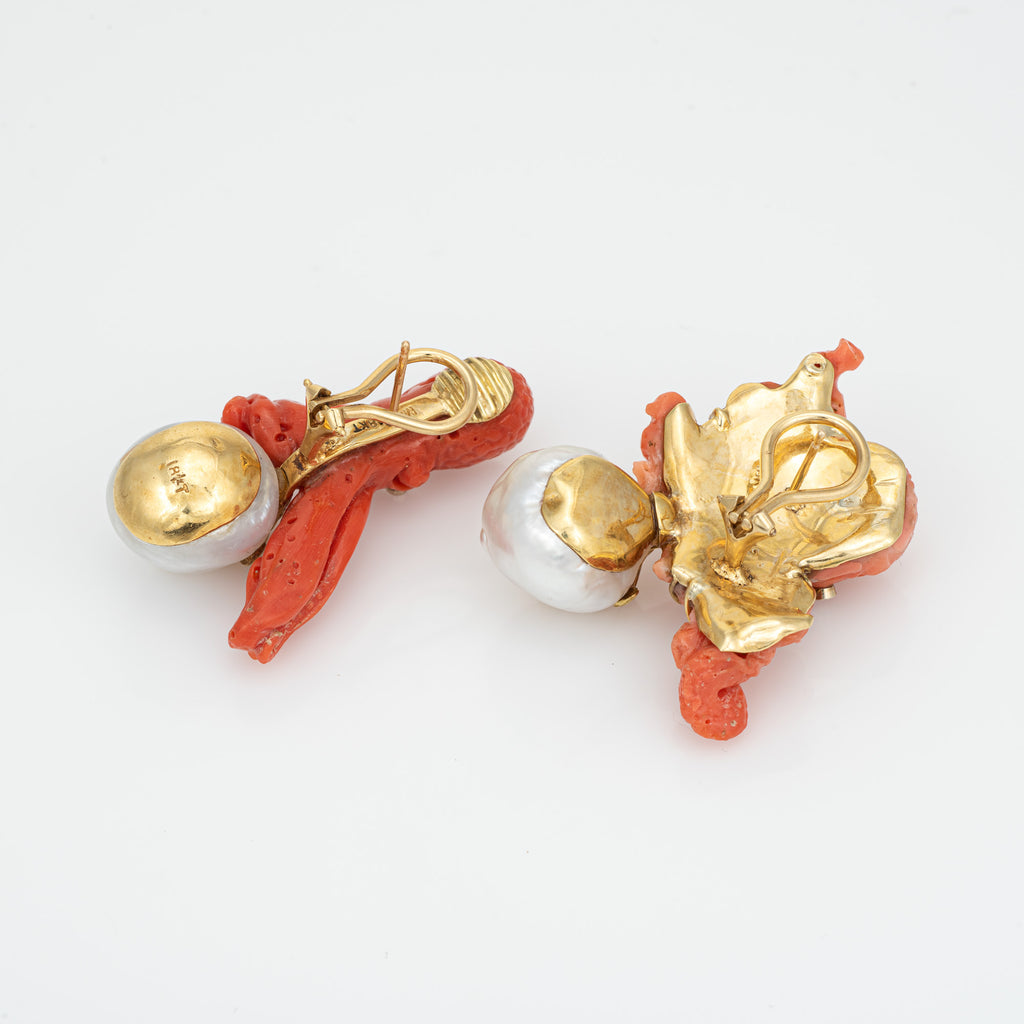 Stones: Carved coral measures 1 1/4 x 1 1/4 and 1 1/2 x 1 inch. Baroque pearls each measure 16mm. Diamonds total an estimated 0.14 carats (estimated at H-I color and VS2-SI1 clarity).