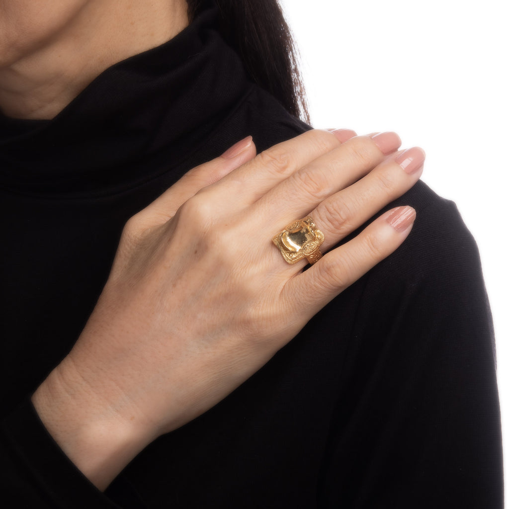 The saddle is slightly curved to hug the finger with a low rise profile. The exterior of the saddle features pretty textured and embossed floral details. The cocktail ring makes a nice statement on the hand. The low rise ring (5.5mm - 0.21 inches) sits comfortably on the finger.