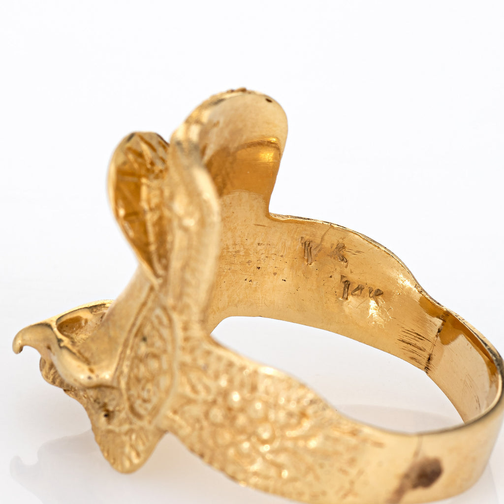 Metal & Hallmark: 14 karat yellow gold. The ring is hallmarked "14k"