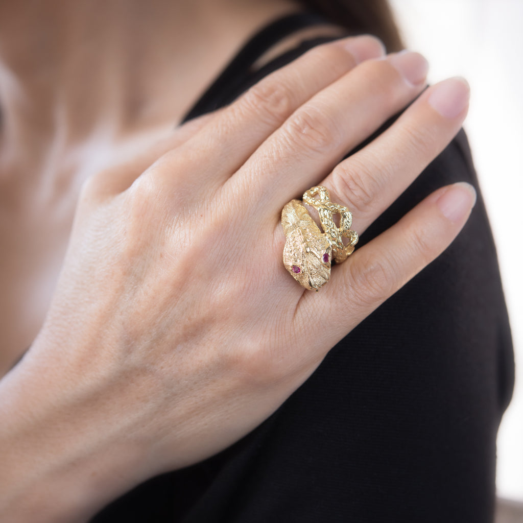 Finely detailed snake ring, crafted in 18 karat yellow gold.