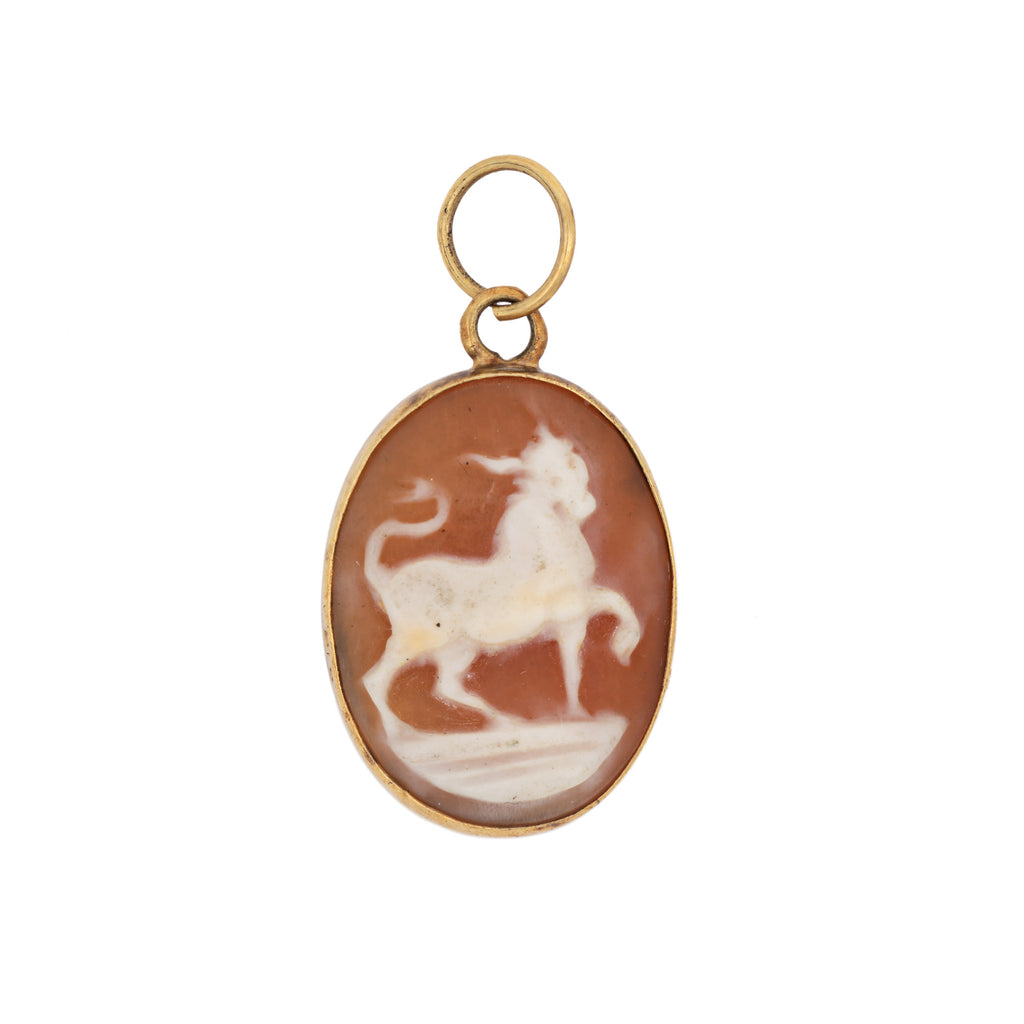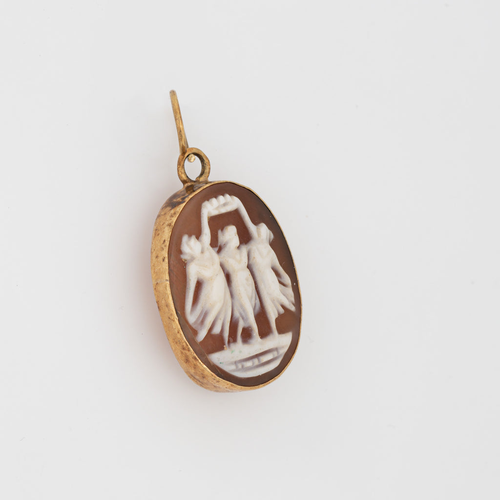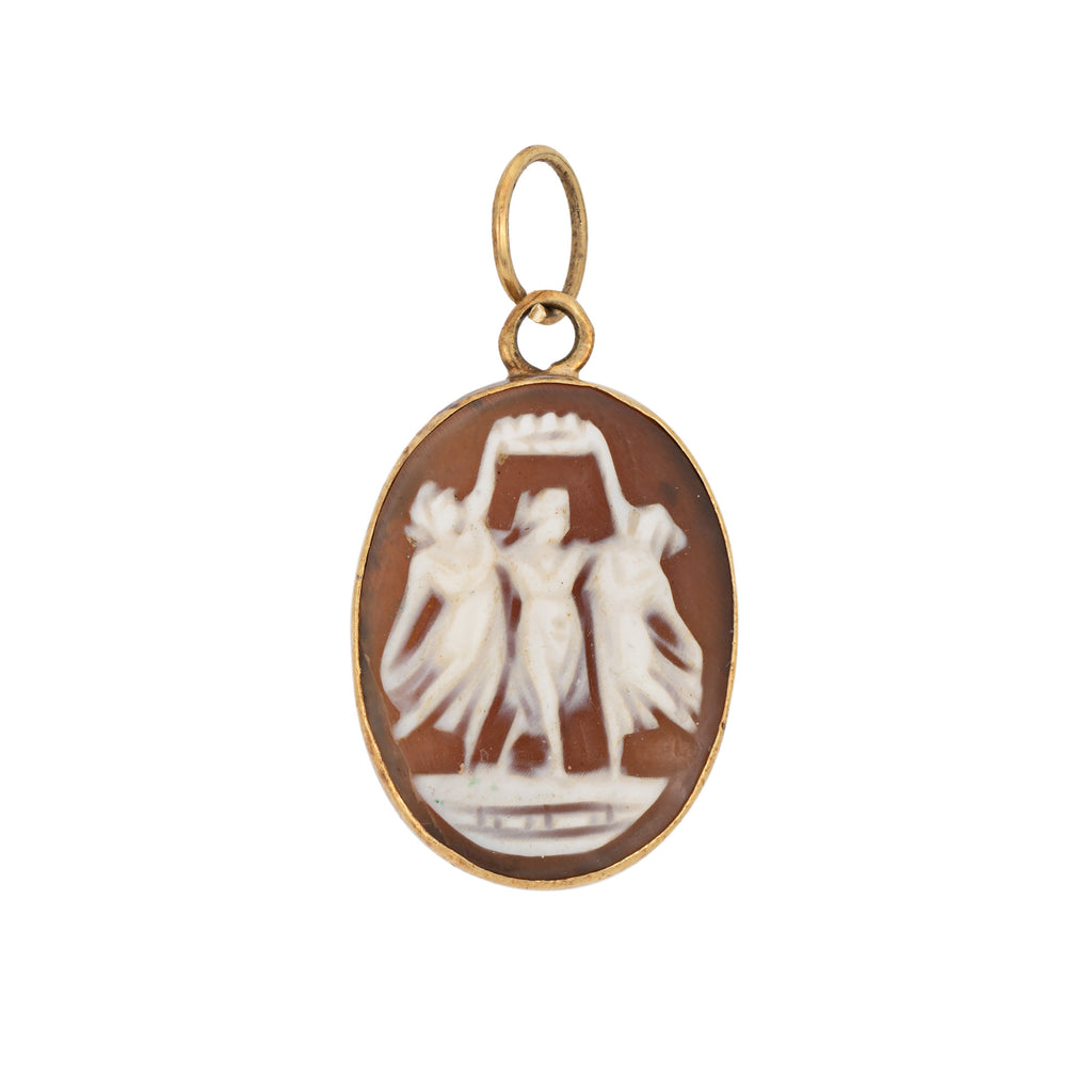 The distinct pendant features a carved cameo depicting the Three Graces with the reverse side an animal. Smaller in scale the piece is great worn as a pendant on a chain or on a charm bracelet. The pendant bale measures 5mm wide and can accommodate a thinner to medium thick chain.
