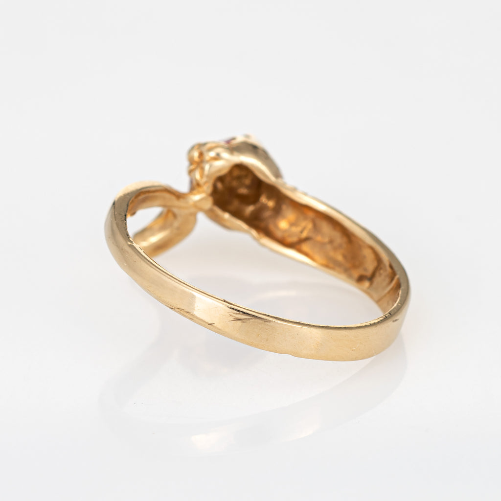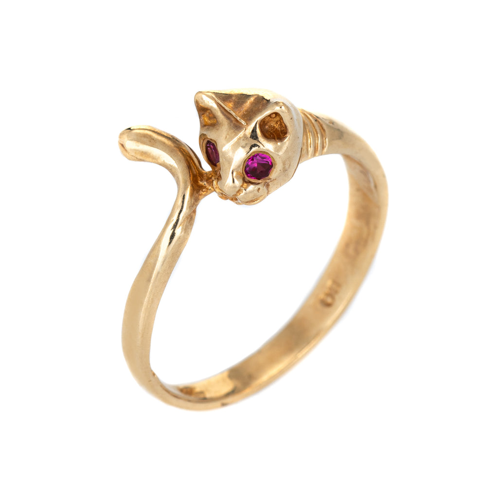 Vintage Cat Ring Ruby Eyes 14k Yellow Gold Estate Animal Jewelry Stacking Band