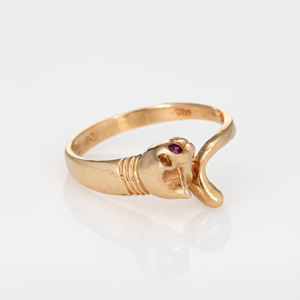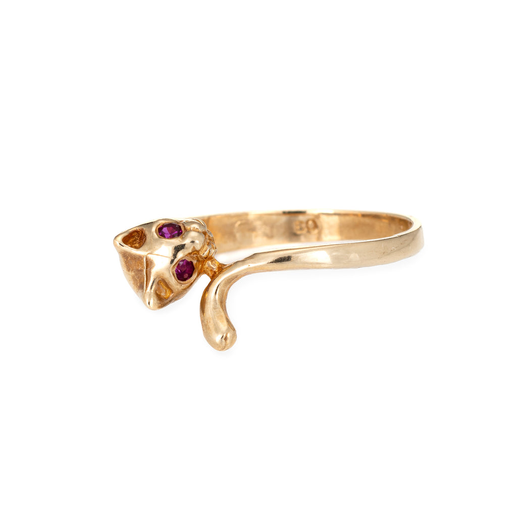 Stylish vintage cat ring set with ruby eyes, crafted in 14 karat yellow gold.
