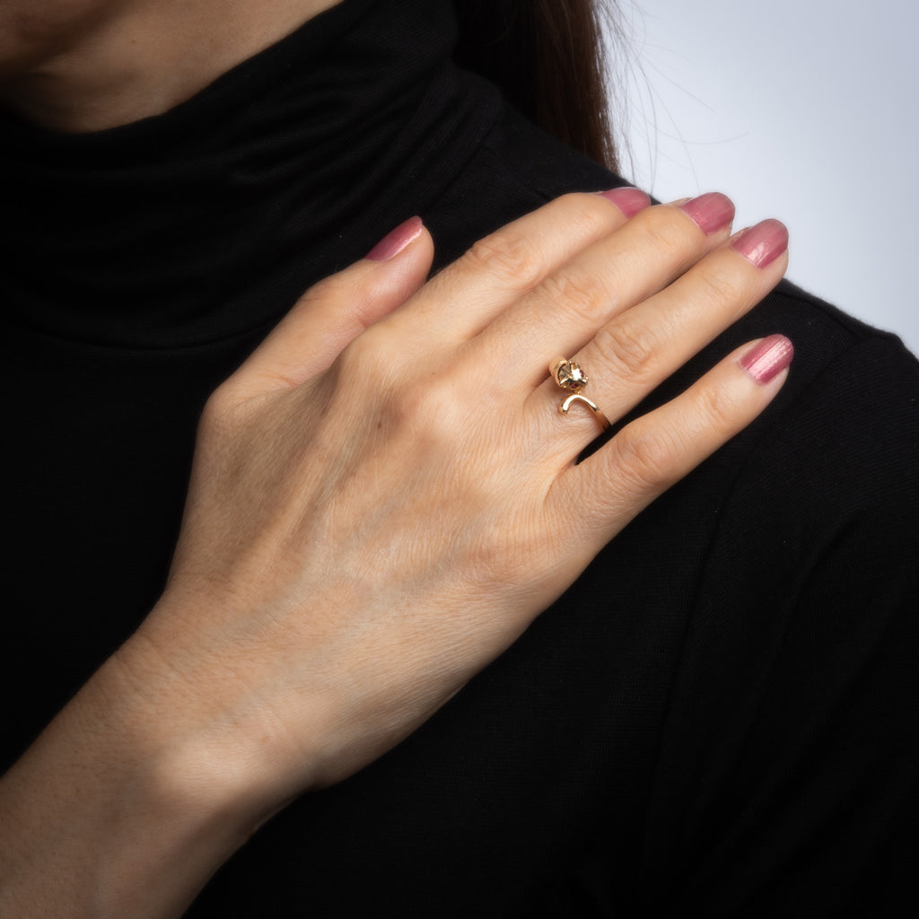 The kitty cat ring wraps around the finger with the tail in a curved position. The band is slender in scale and is great for stacking. The low rise ring (6mm - 0.23 inches) sits comfortably on the finger.