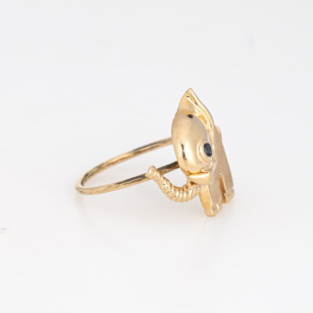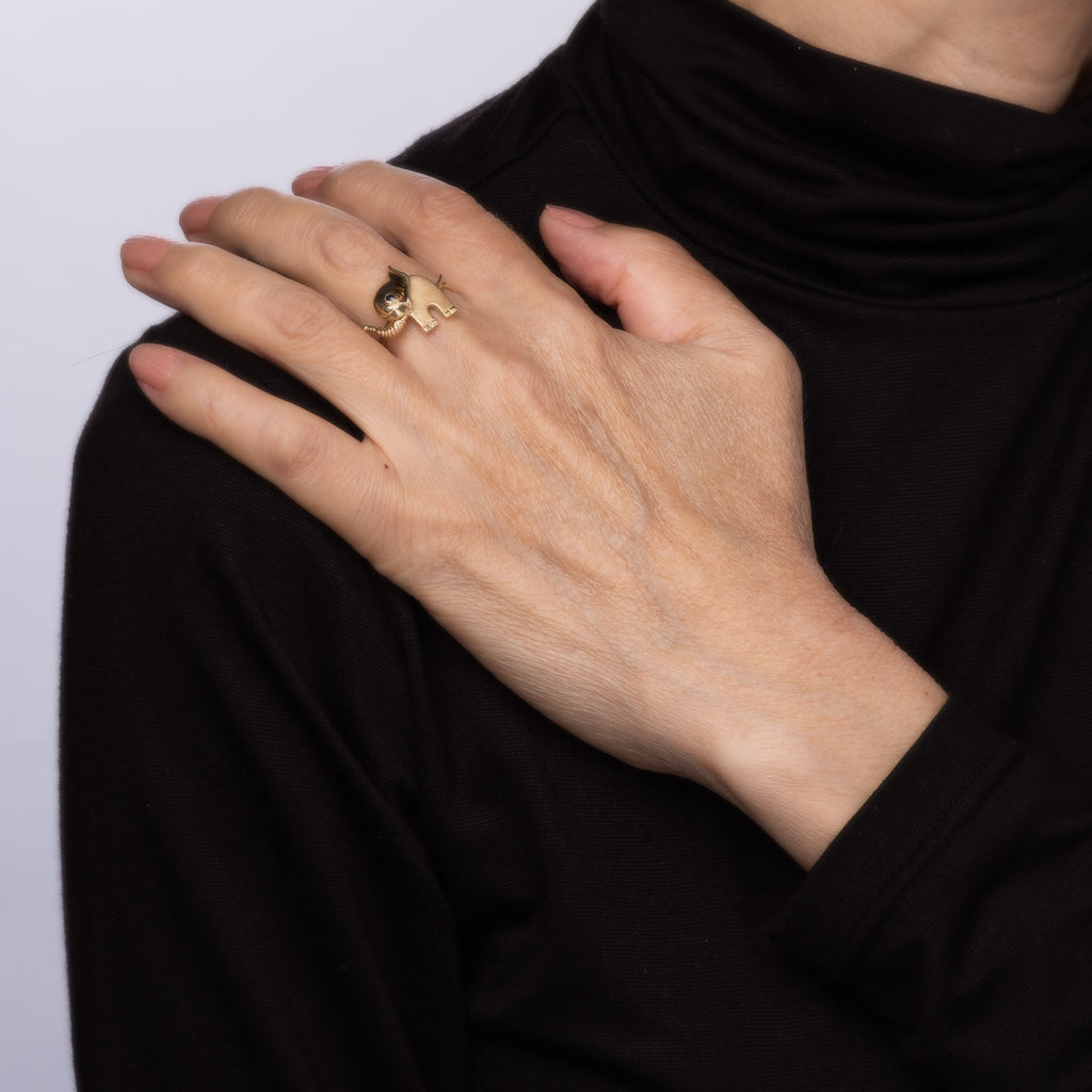 Originally a vintage stick pin the Elephant ring is crafted in 14 karat yellow gold.