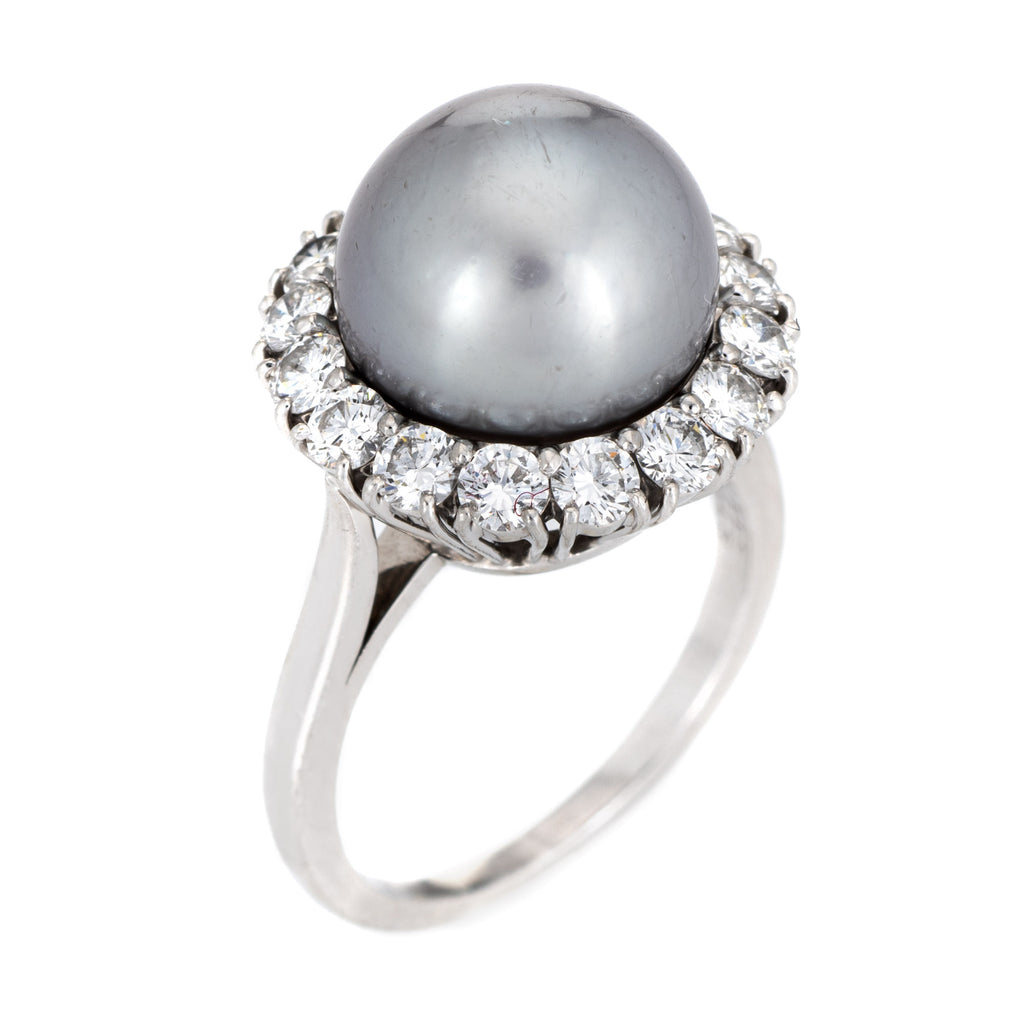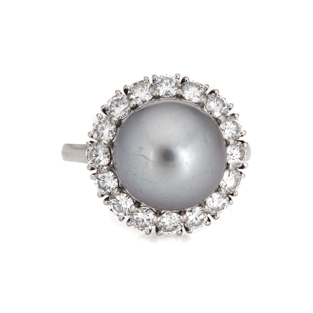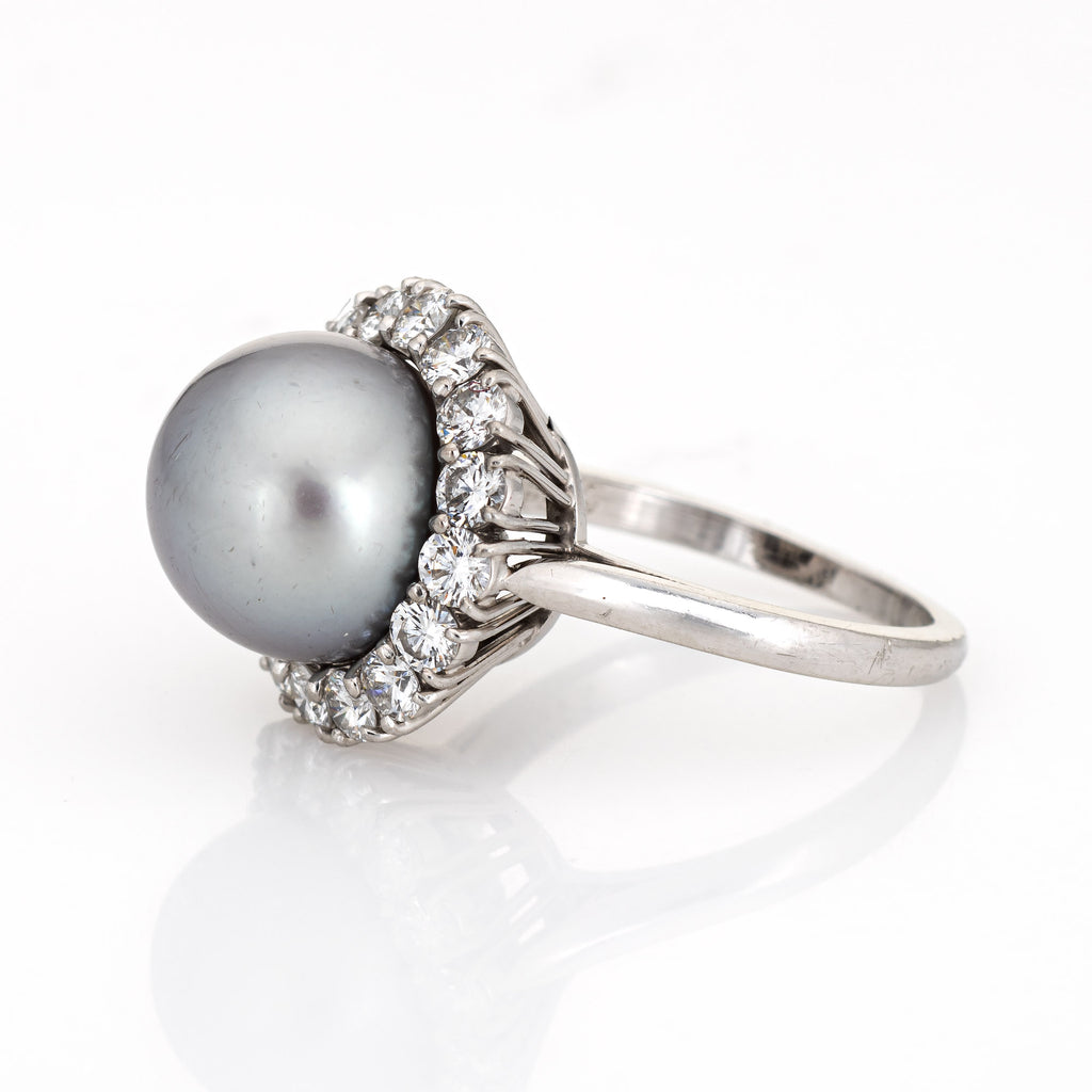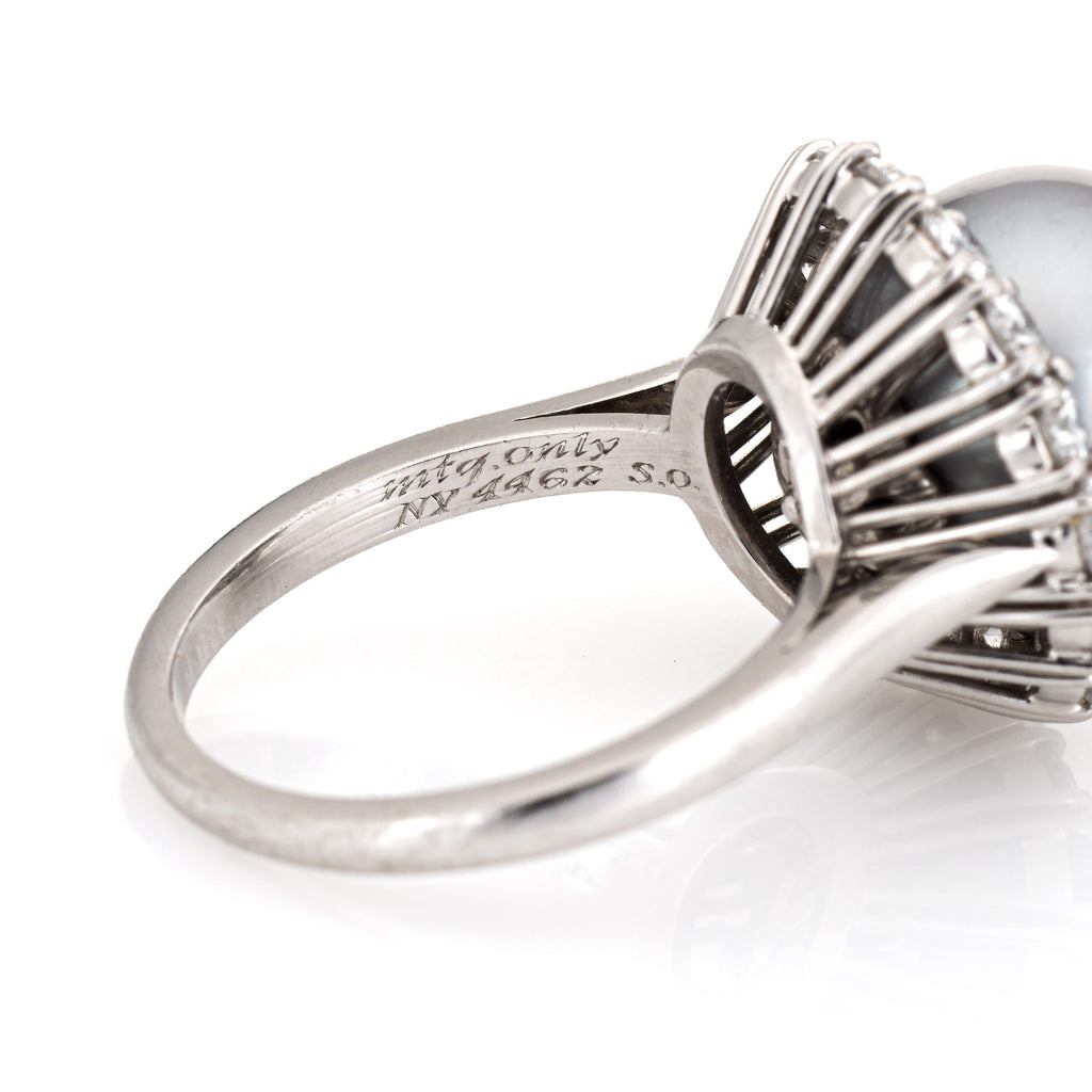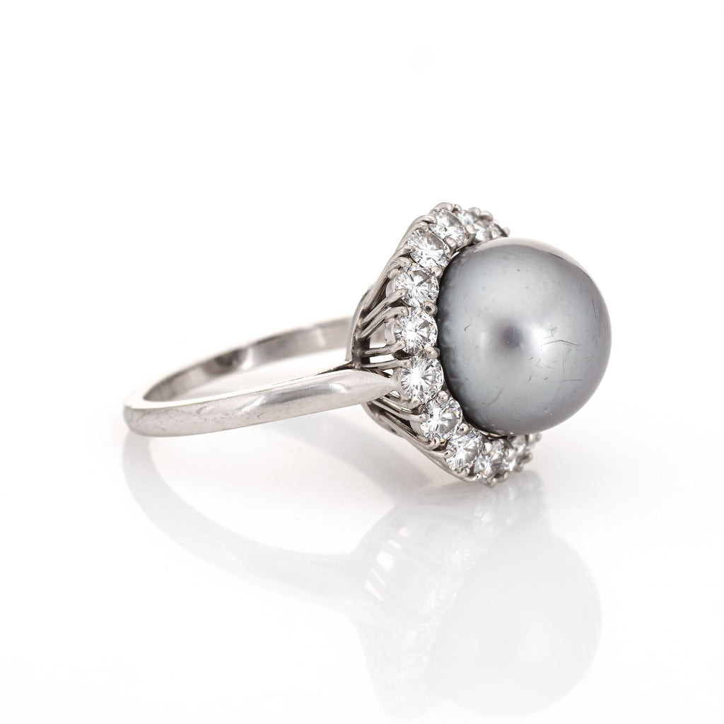 Finely detailed vintage Van Cleef & Arpels South Sea Pearl & diamond ring crafted in platinum (circa 1980s to 1990s).