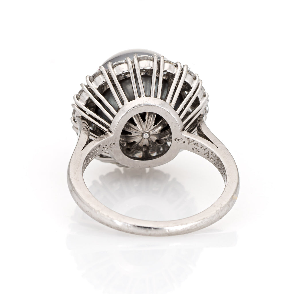 The mounting is made by Van Cleef & Arpels, signed and numbered with a special designation of "mtg only" for mounting only. Van Cleef customers have been known to use their own gemstones in a Van Cleef setting (as is the case with this ring). It is likely the pearl was a family heirloom or possibly a gift that was set in the mounting. The diamonds are from and set by Van Cleef & Arpels. The ring is also stamped "S.O" for special order, a select service offered by Van Cleef & Arpels to their clientele. The ring is a wonderful example of Van Cleef & Arpels quality and impeccable style. Great for day or evening wear.
