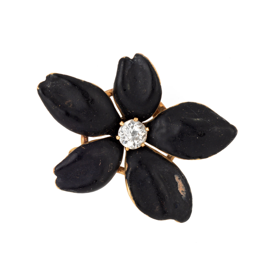 One estimated 0.25 carat old mine cut diamond is set into the flower (estimated at I-J color and SI2-I1 clarity). The striking and dramatic brooch (also wearable as a pendant) highlights a bright shimmering old mine cut diamond to the center. Muted matte black enamel petals offer a lifelike look to the flower. The versatile piece can be worn as a brooch or pendant on a chain.