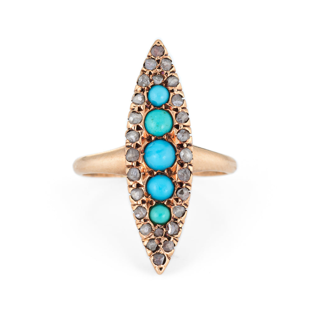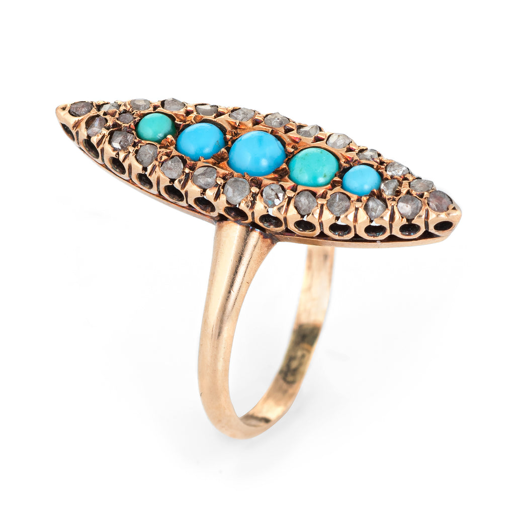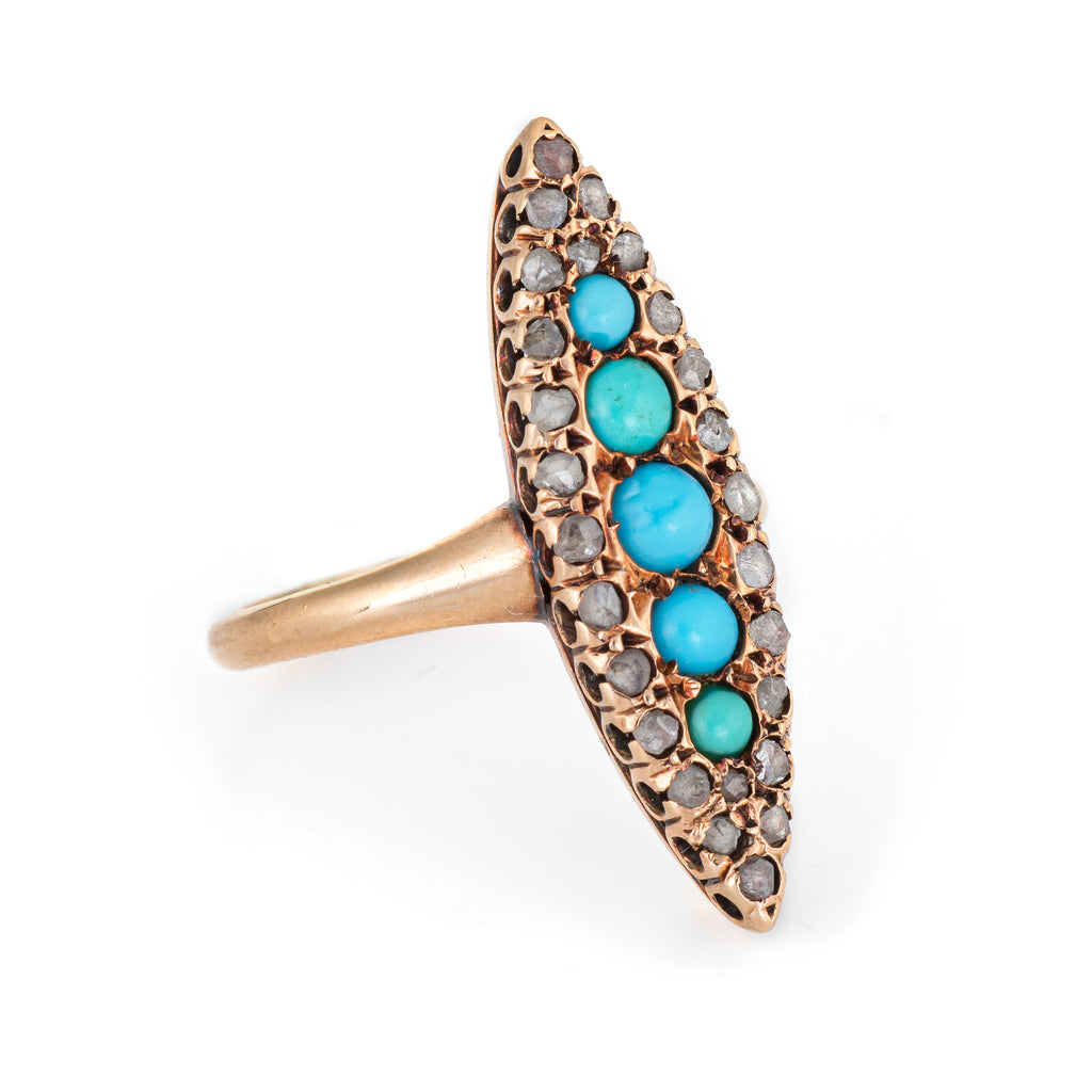Finely detailed antique Victorian turquoise & diamond navette ring (circa 1880s to 1900s), crafted in 10 karat yellow gold.