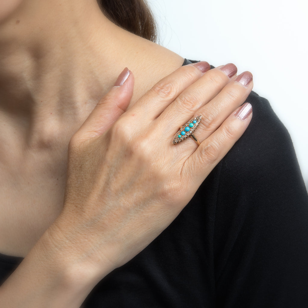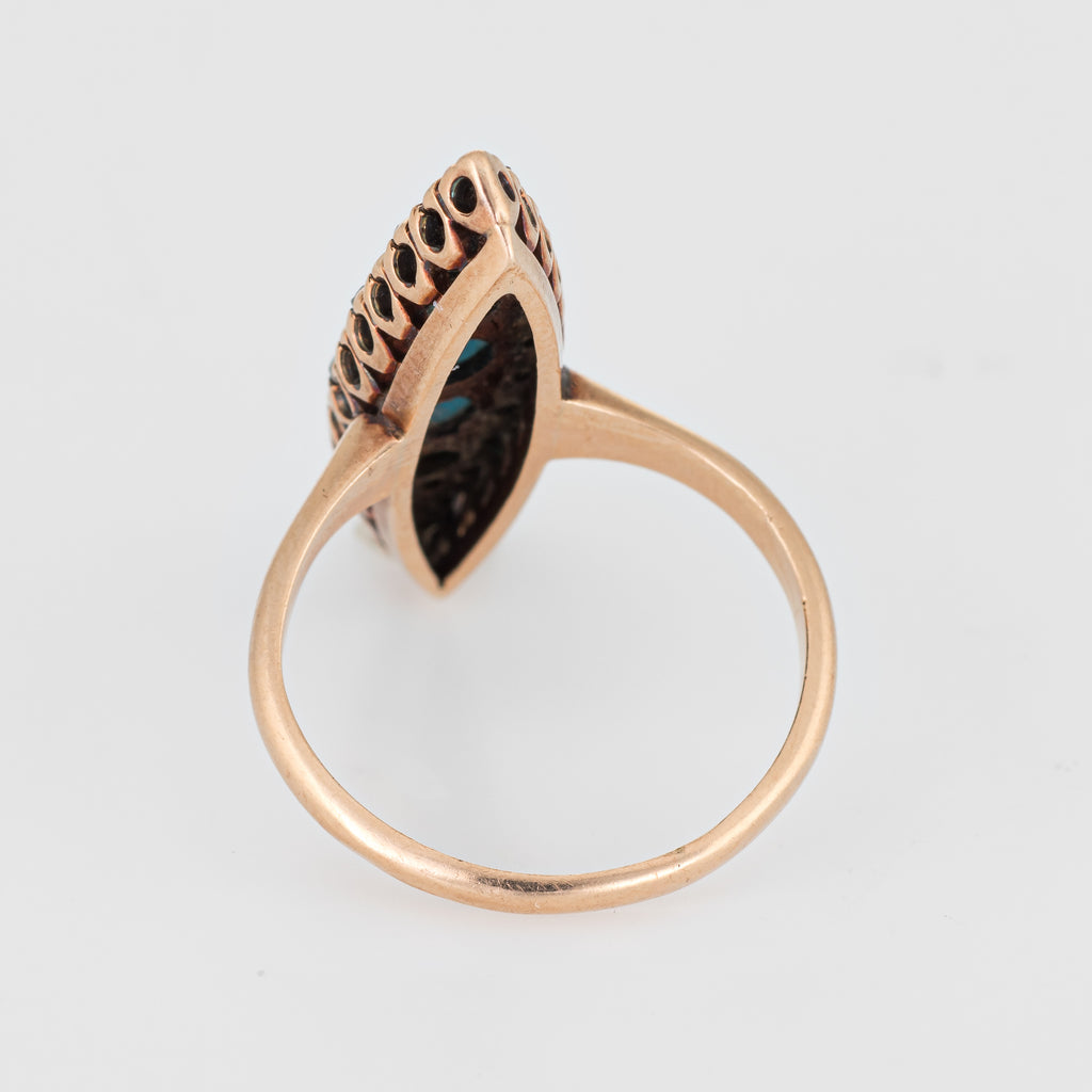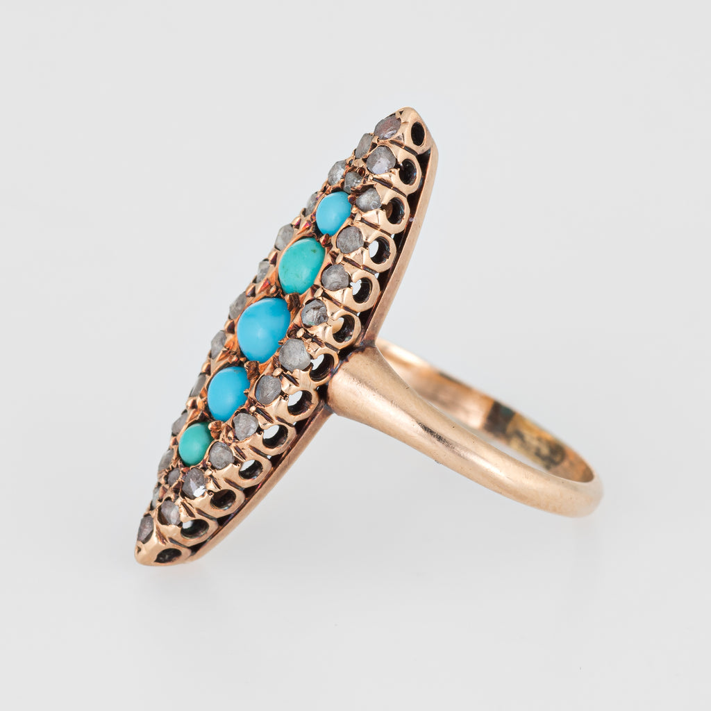 Finely detailed antique Victorian turquoise & diamond navette ring (circa 1880s to 1900s), crafted in 10 karat yellow gold.