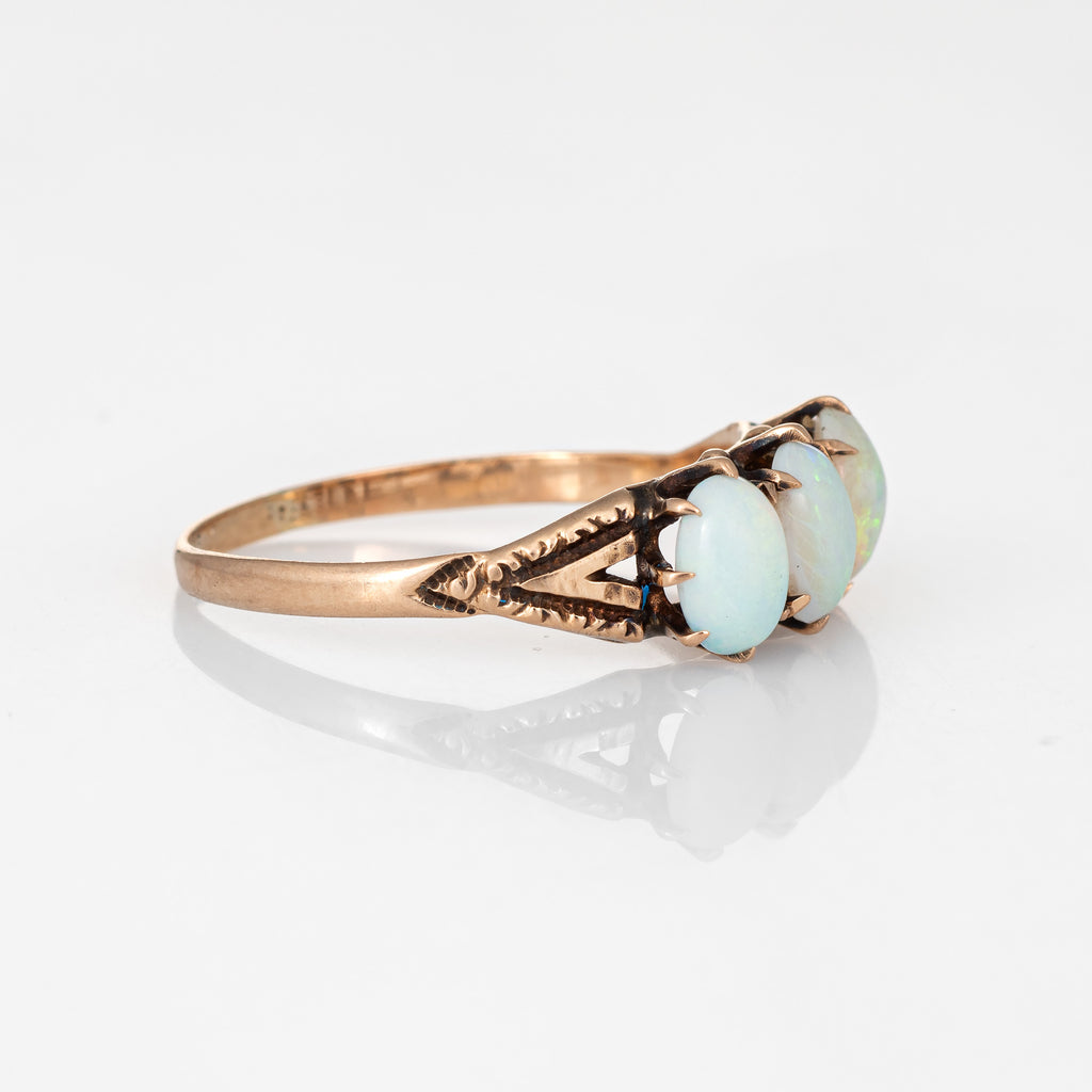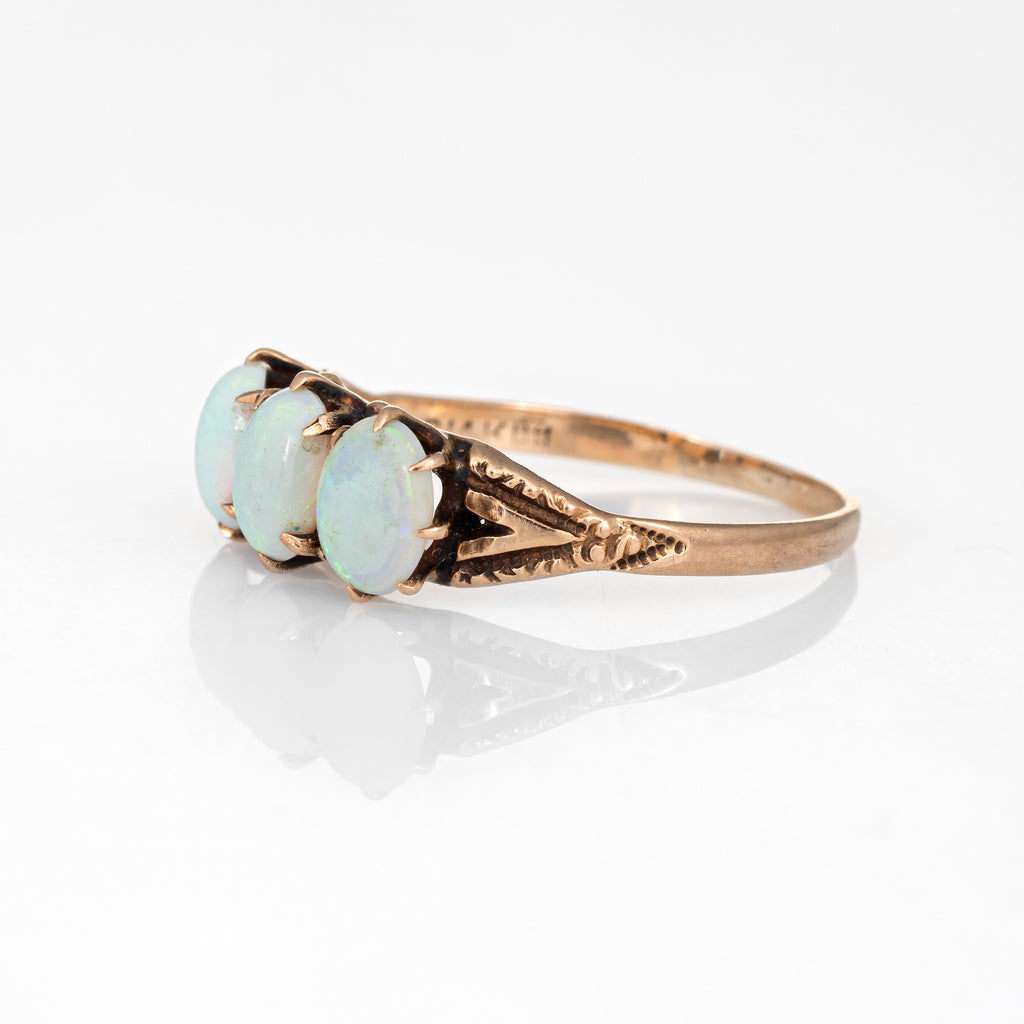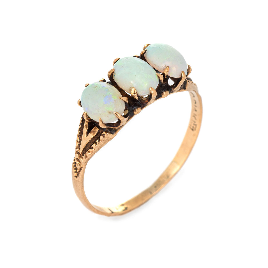 Finely detailed antique Victorian era three stone opal ring (circa 1880s to 1900s), crafted in 14 karat yellow gold.
