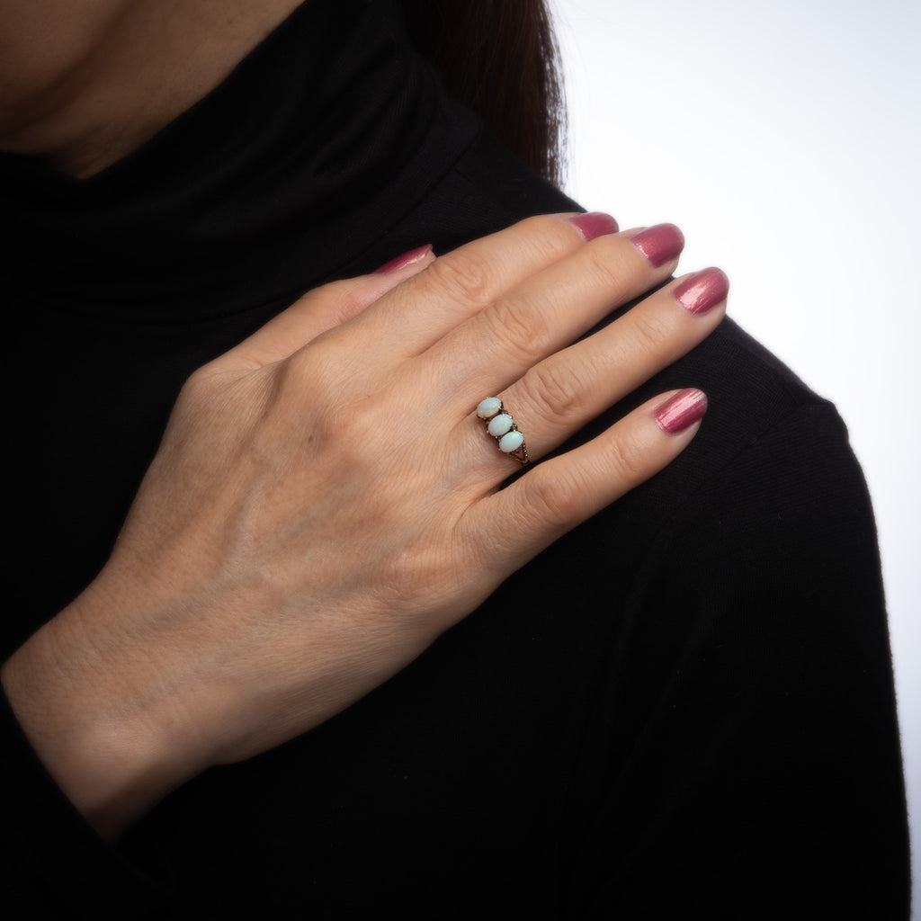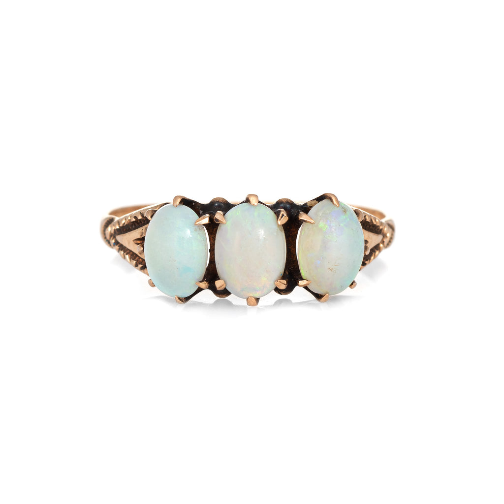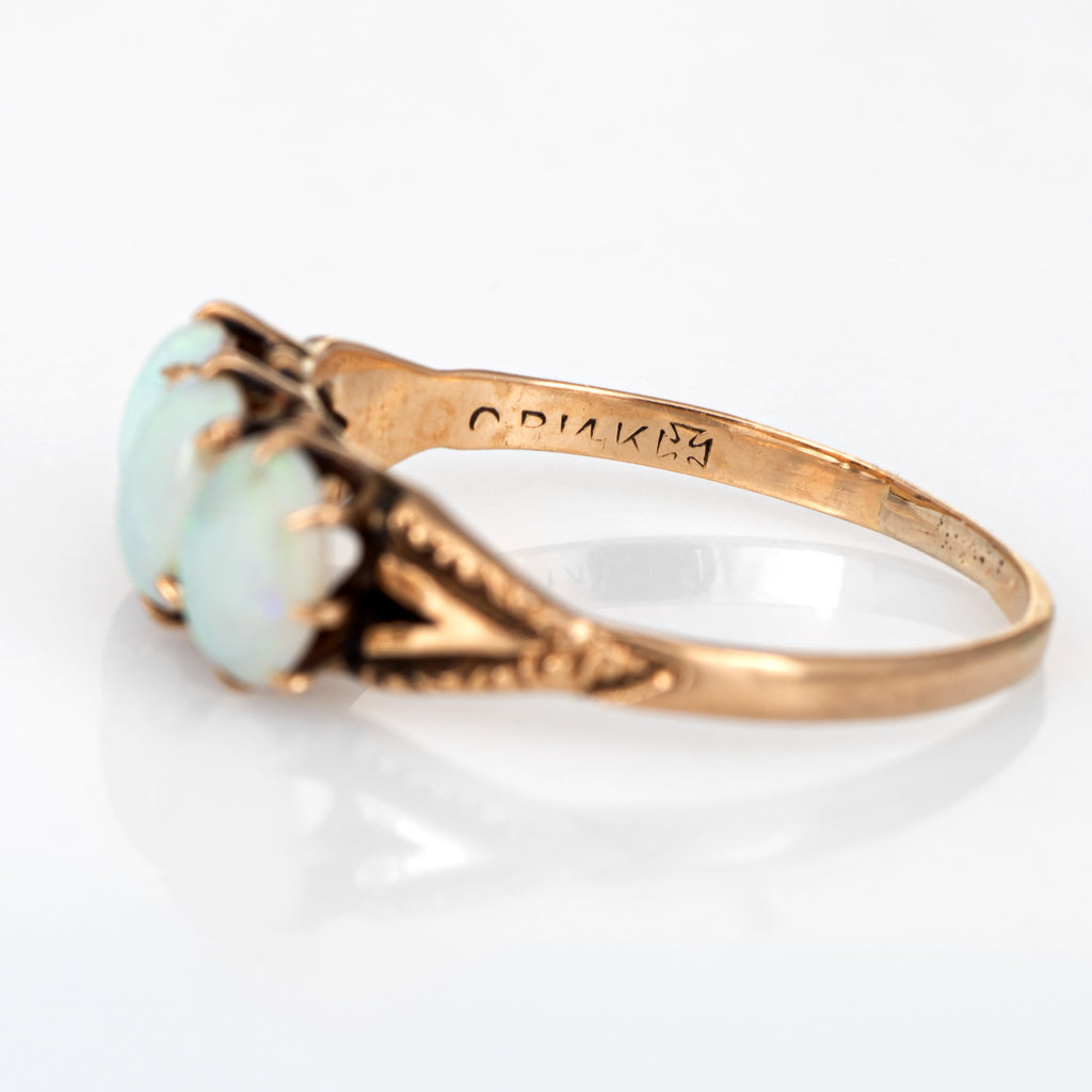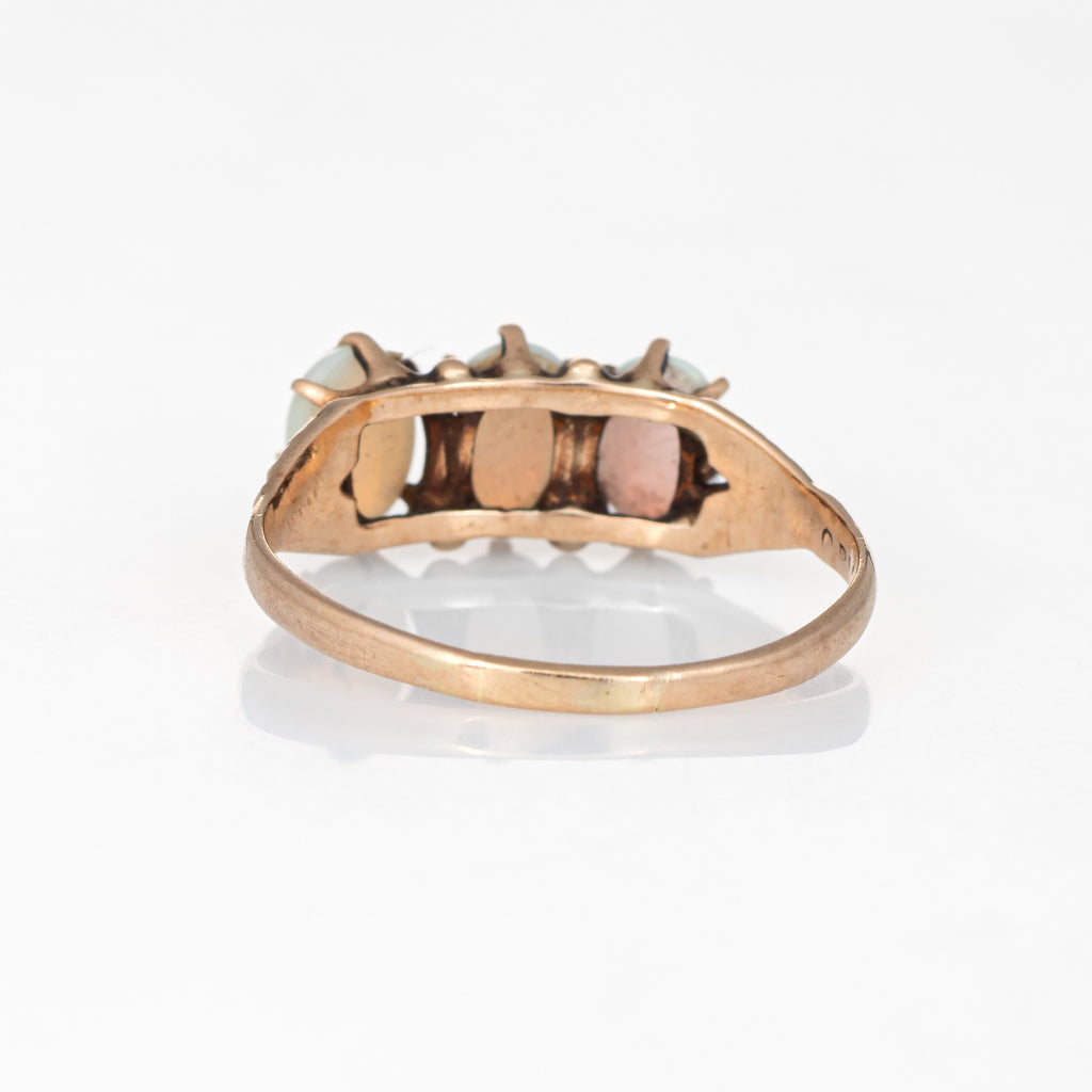 Finely detailed antique Victorian era three stone opal ring (circa 1880s to 1900s), crafted in 14 karat yellow gold.