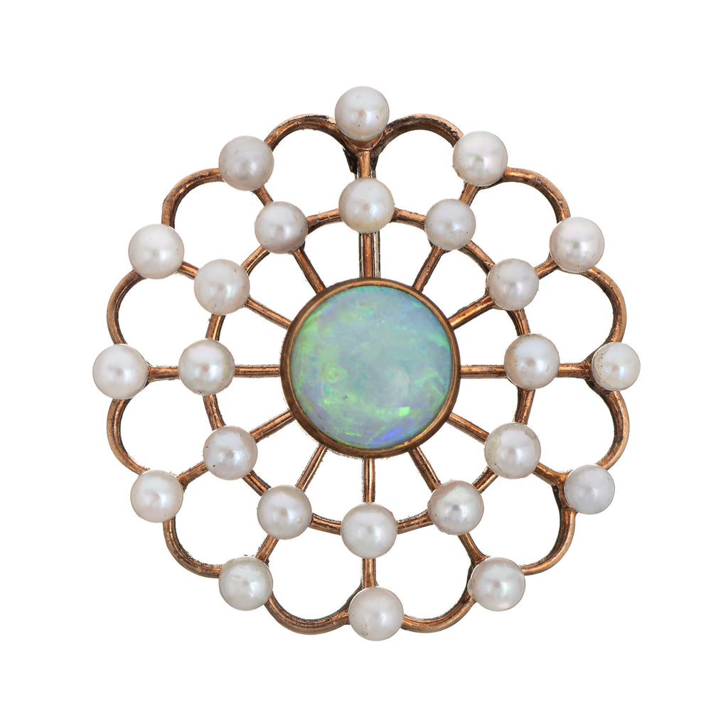 Finely detailed antique Victorian opal & pearl circular pendant (circa 1880s to 1900s), crafted in 14 karat rose gold.