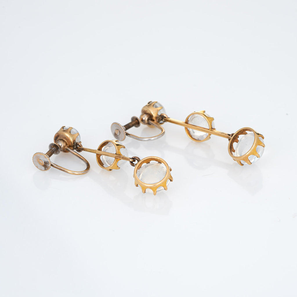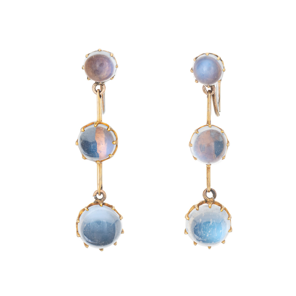 Finely detailed pair of antique Victorian moonstone drop earrings (circa 1880s to 1900s) crafted in 14k yellow gold.