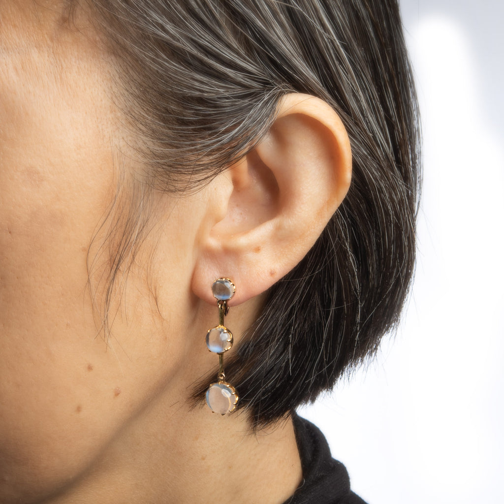 The charming earrings are set with alluring, glowing rainbow hued moonstones, set securely into open backed claw mounts. The moonstones display vivid flash adularescence in natural and incandescent light. The earrings are great for day or evening wear.