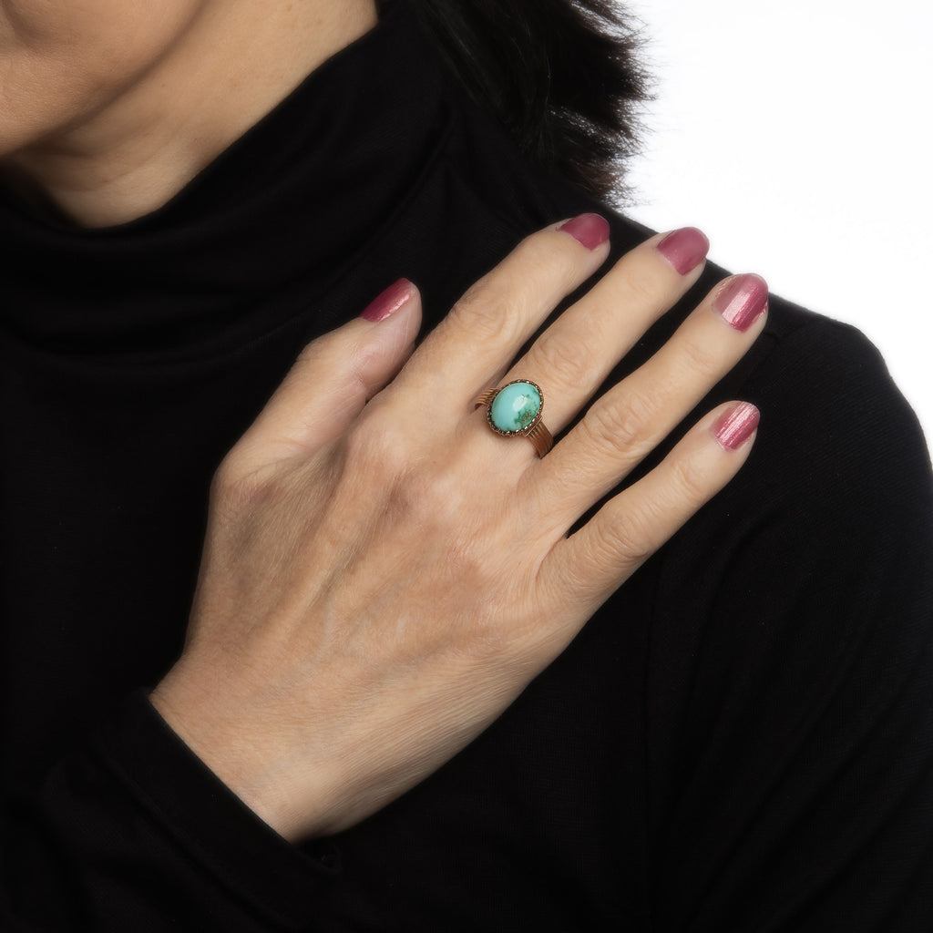 The turquoise measures 12mm x 10mm (estimated at 4 carats). Note: color variance to the turquoise (inherent to the stone). The cabochon cut turquoise is set into an ornate multi-pronged mount, with a ridged design to the side shoulders. The oval signet mount rises 7mm (0.27 inches) from the finger.