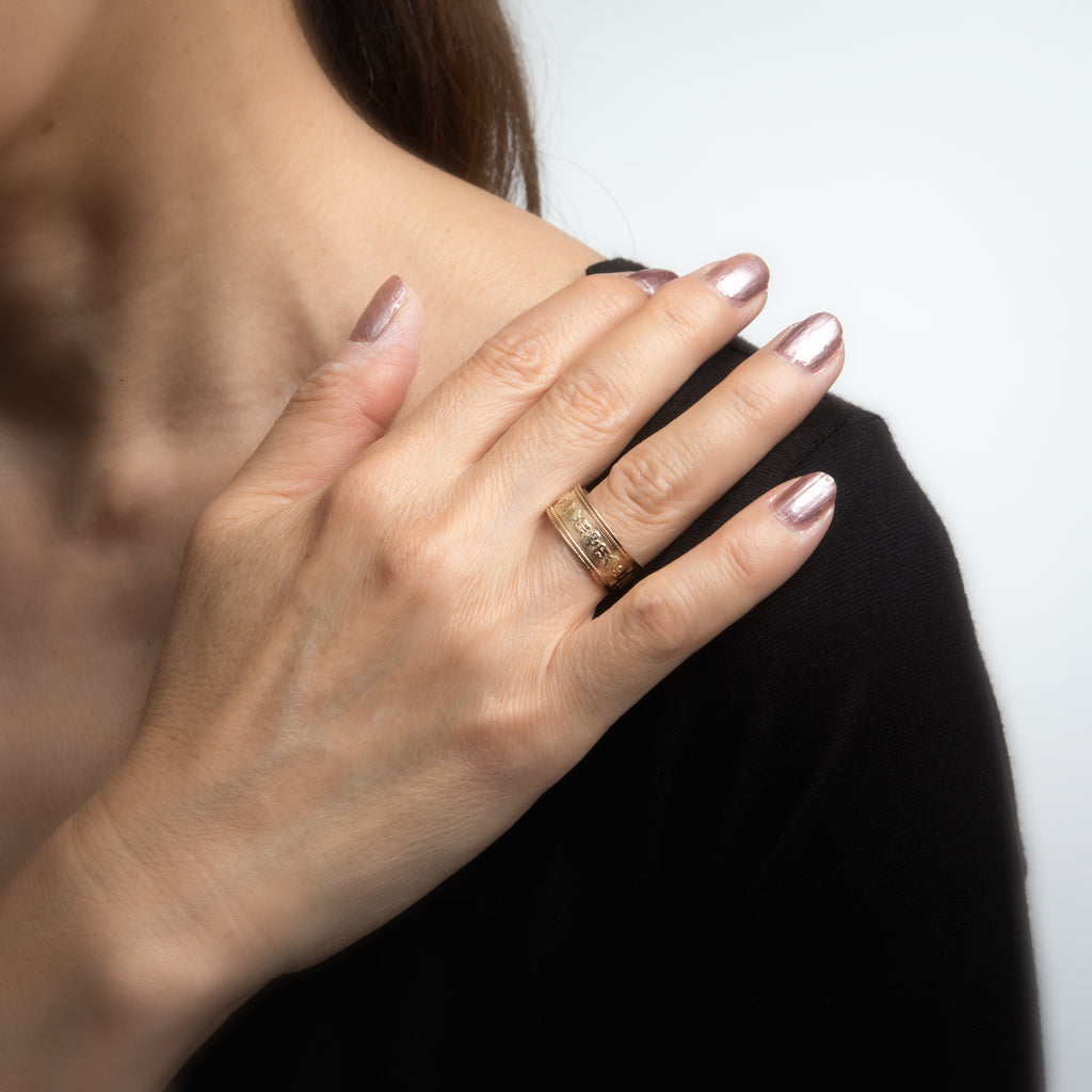 Size & Measurements: The ring is a size 7 1/2 (not sizable). The band measures 8mm wide (0.31 inches), rising 1.5mm from the finger.