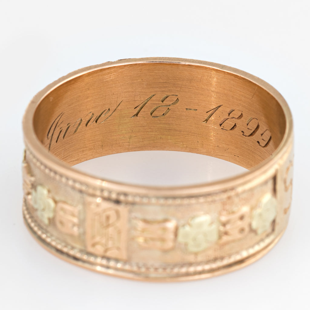 Finely detailed antique Victorian band (circa 1880s to 1900s), crafted in two-tone 10 karat rose & yellow gold.