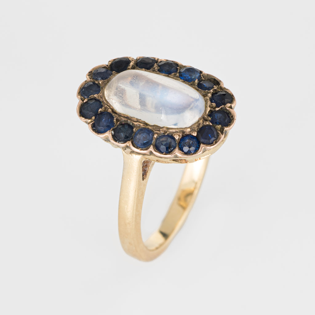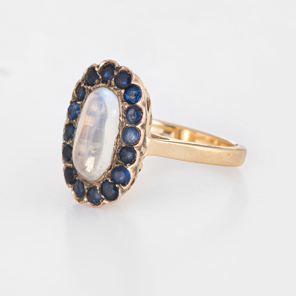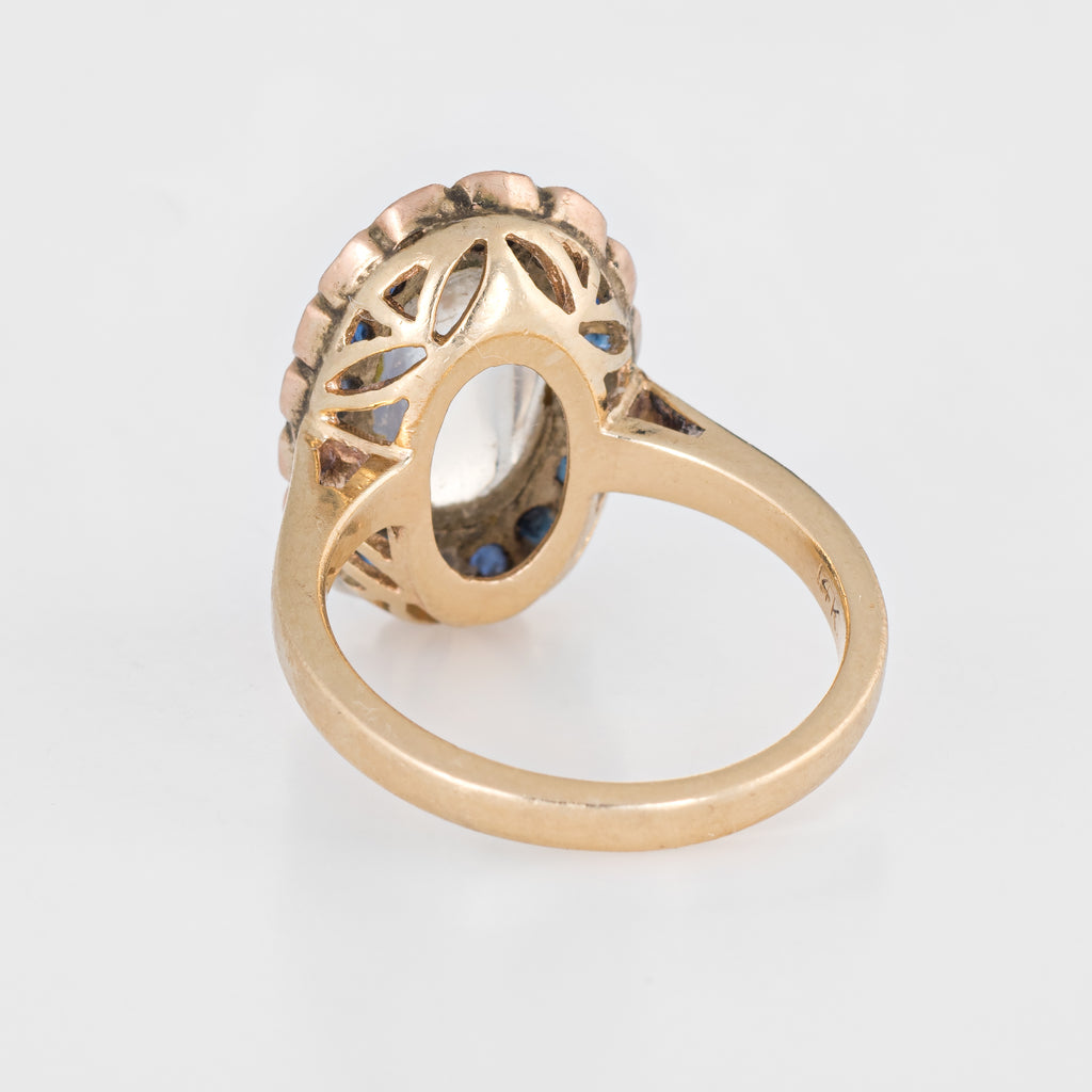 Stylish vintage moonstone & sapphire cocktail ring (circa 1950s to 1960s) crafted in 14 karat yellow gold.
