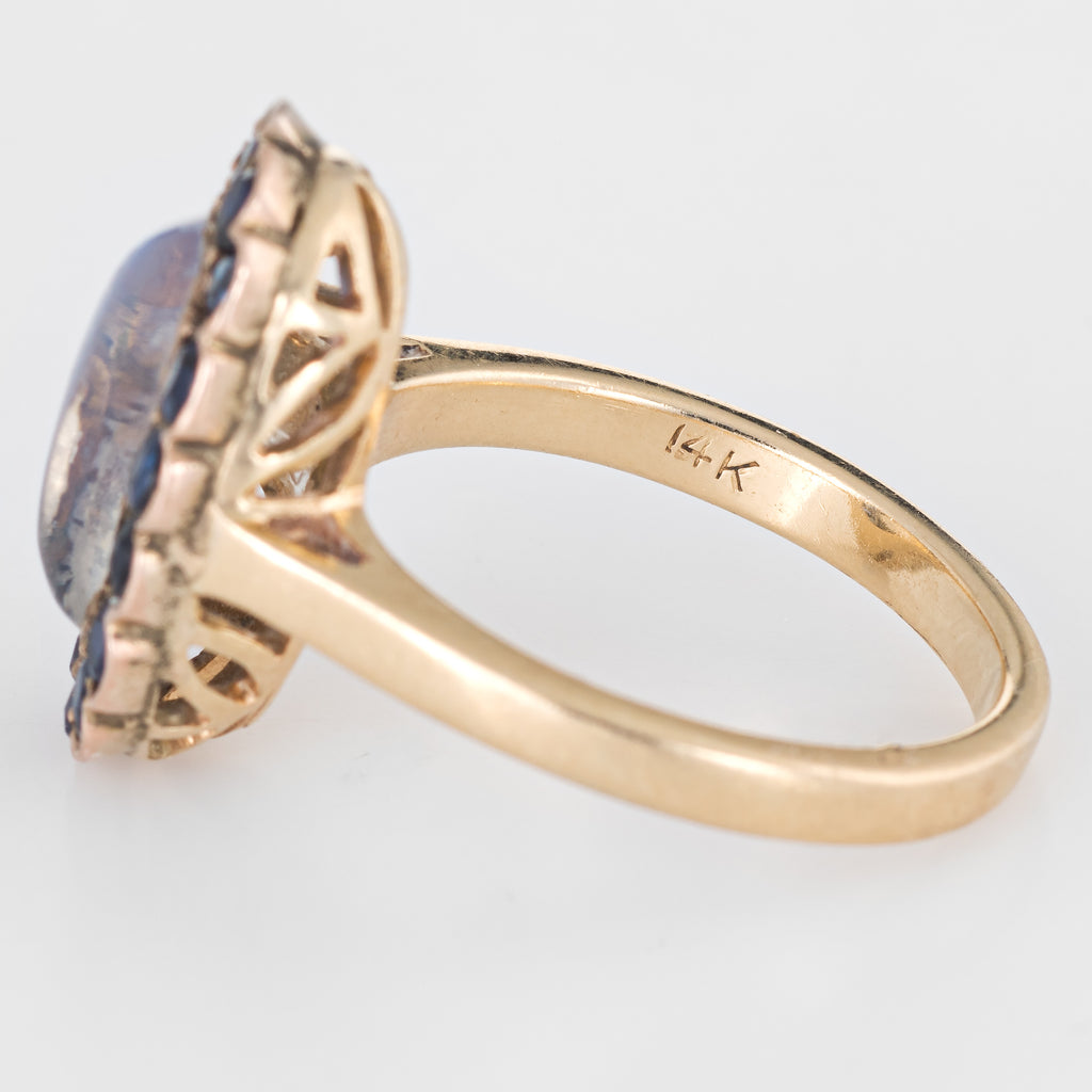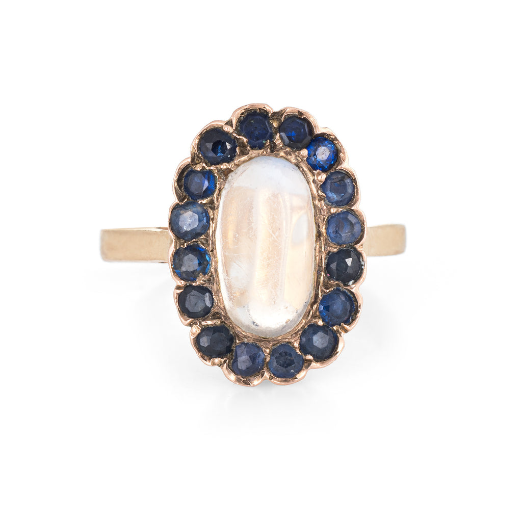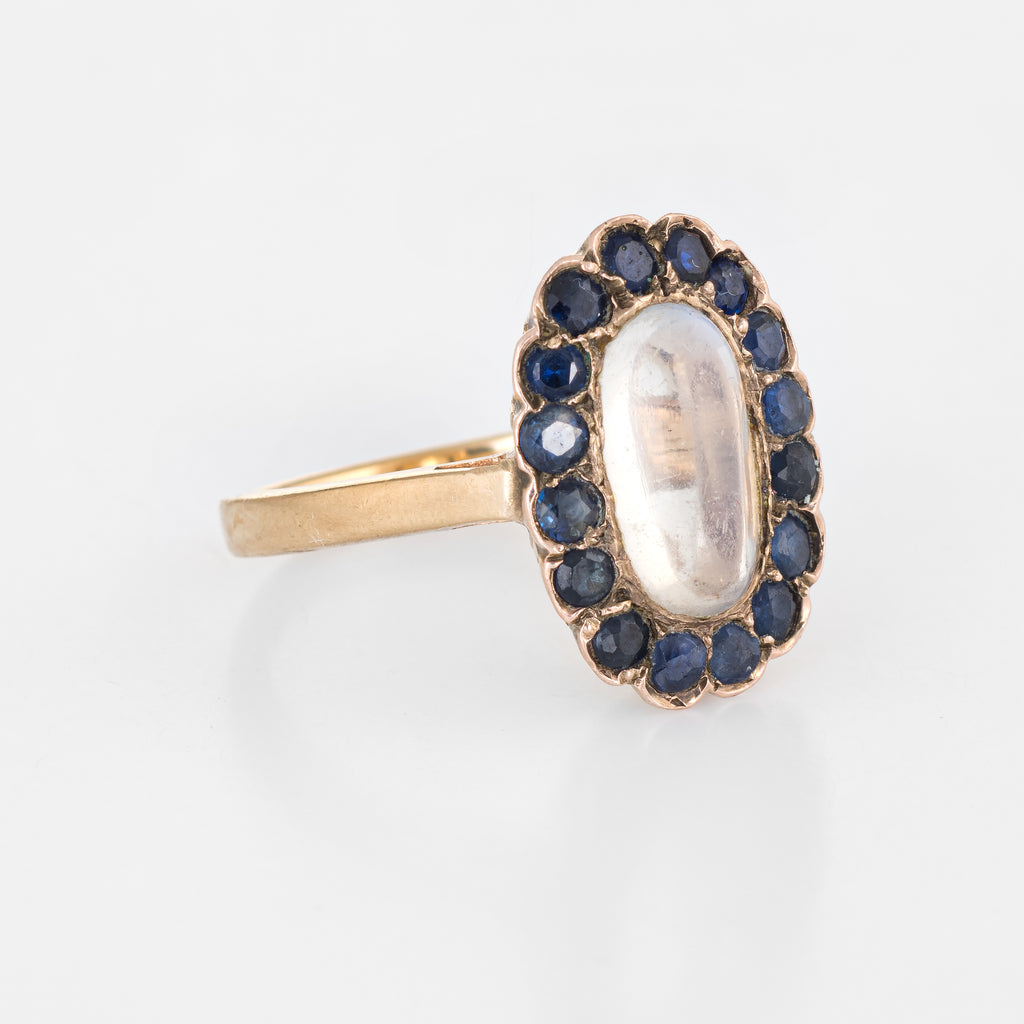 Stylish vintage moonstone & sapphire cocktail ring (circa 1950s to 1960s) crafted in 14 karat yellow gold.