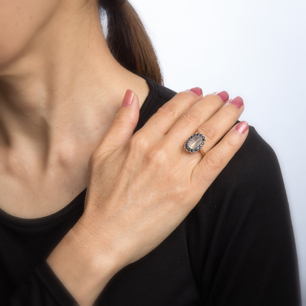The moonstone casts a lunar glow with beautiful blue color flashes evident with every movement of the ring. The sapphires border the moonstone adding color and contrast. The medium rise ring (7mm - 0.27 inches) sits comfortably on the finger. The colorful ring is impactful in design and ideal worn day or night.