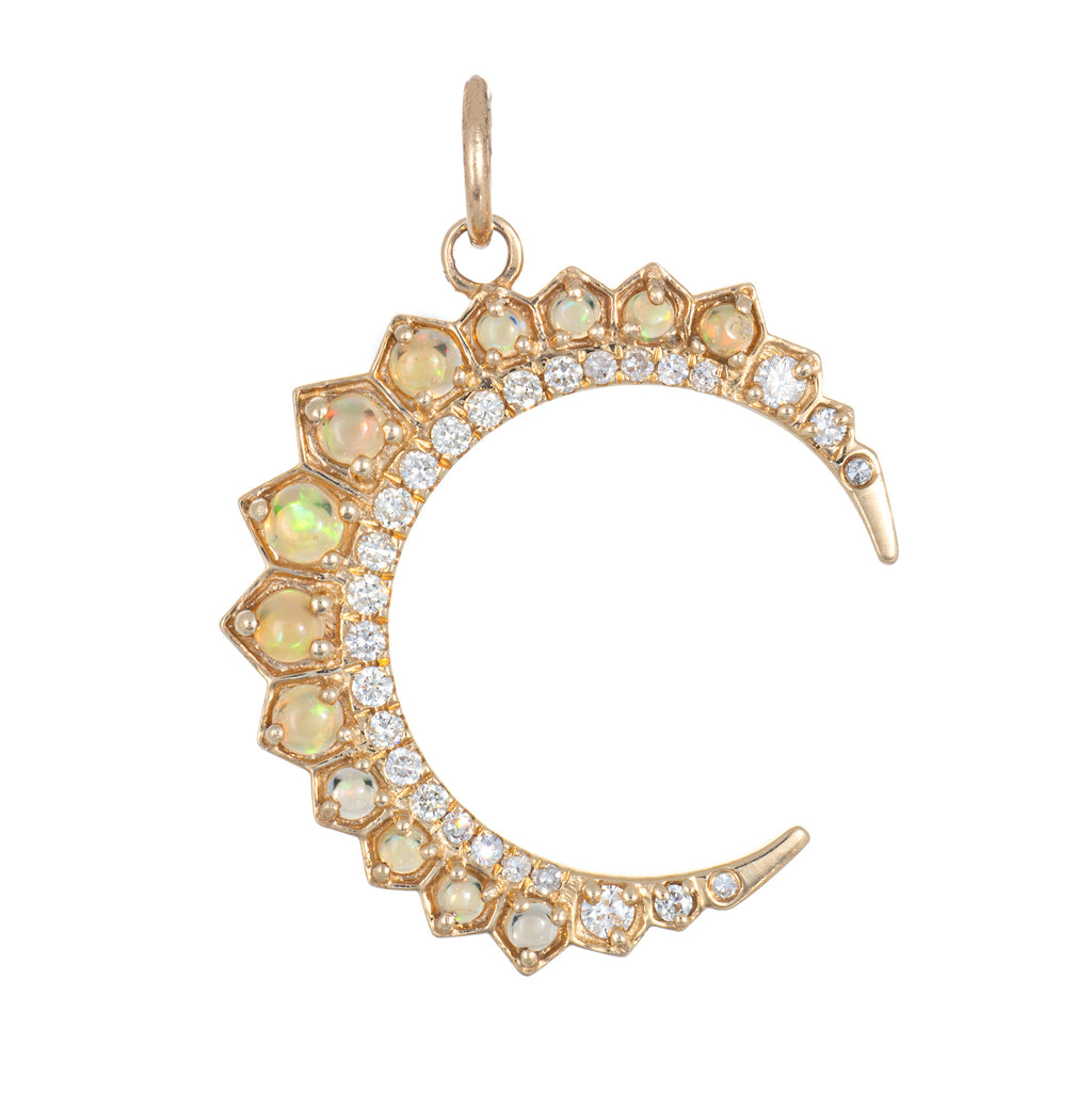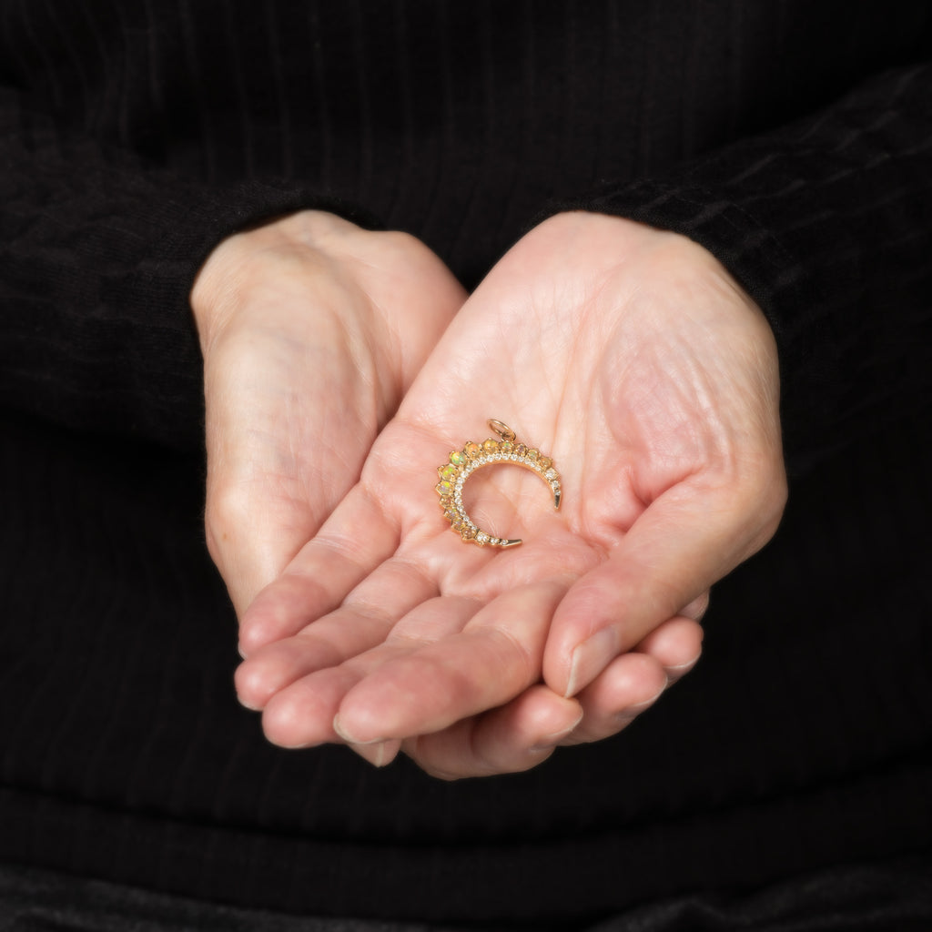 Set into a classic crescent moon motif, the vibrant opals dance with flashes of red, green, orange and yellow, arranged to create a celestial effect, with diamonds evoking a shimmering night sky. The crescent moon motif holds a mystical and enduring charm with a timeless connection to the cosmic world.
