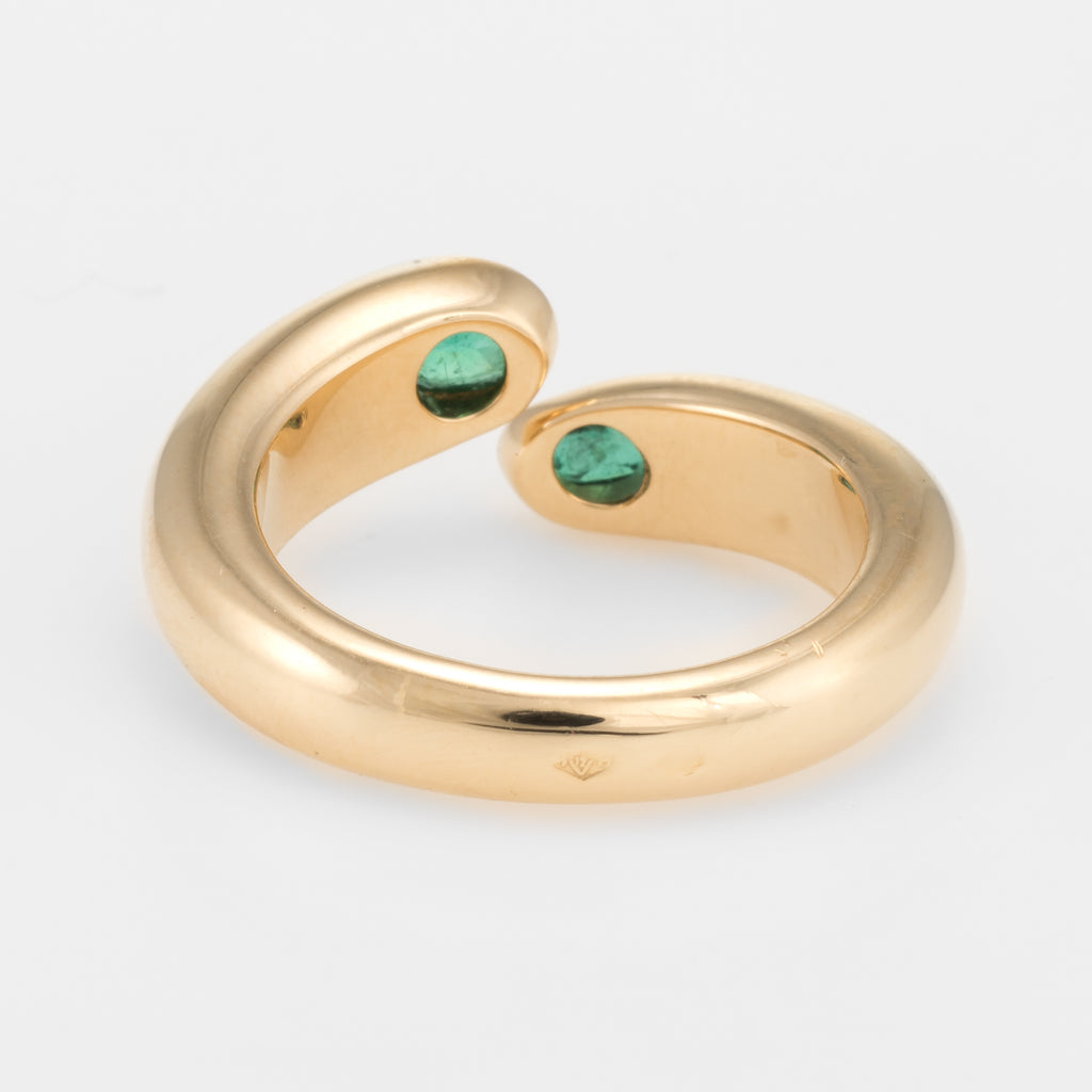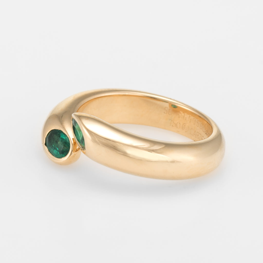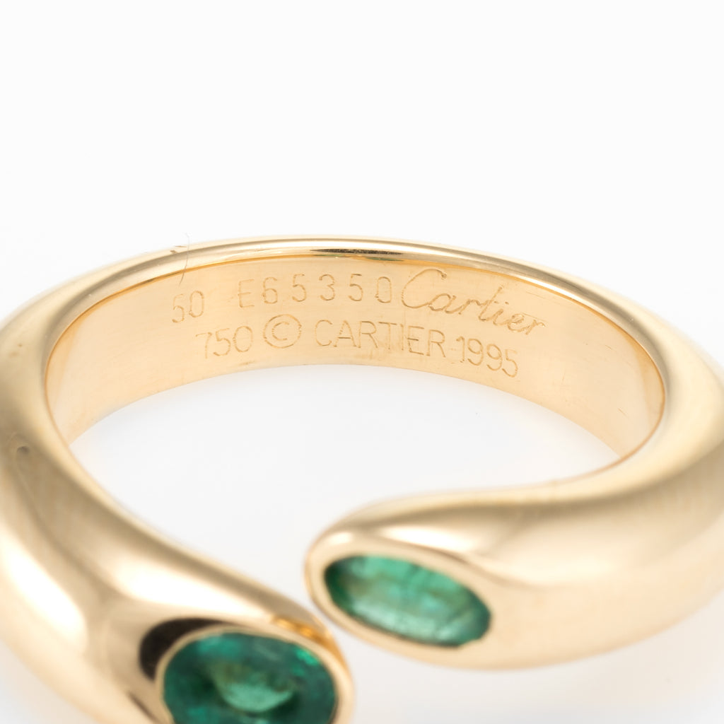 Finely detailed Cartier Ellipse ring, crafted in 18 karat yellow gold. Emeralds measure 4.25mm x 2.75mm and total an estimated 0.40 carats. The emeralds are in excellent condition and free of cracks or chips. The ring is circa 1995 and in excellent condition. Weight: 8.7 grams. Size: 5 1/4. Can be resized. The ring is hallmarked "750" for 18 karat gold, "Cartier", the ring size "50", the year "1995" and the serial number.