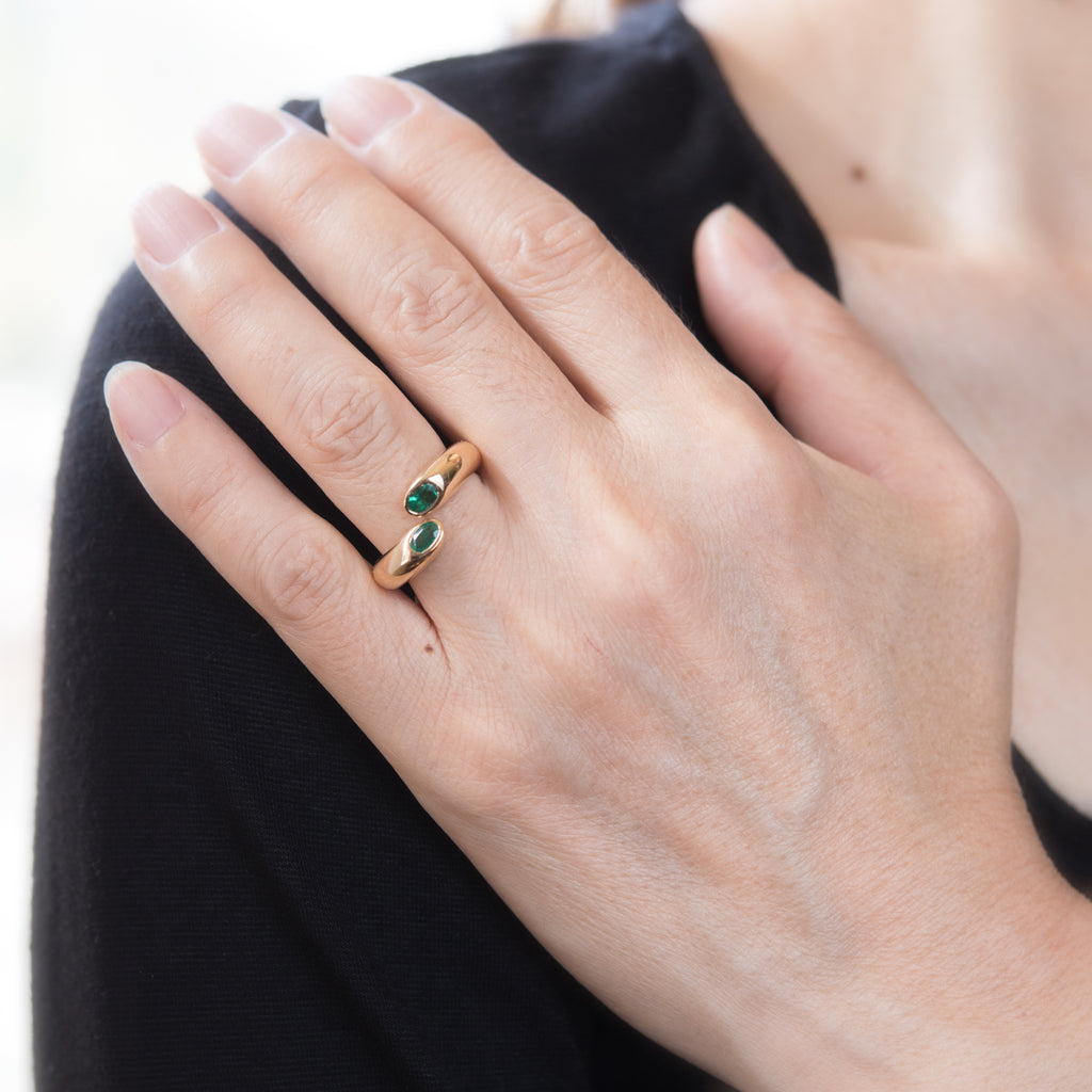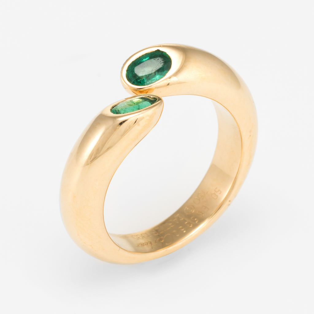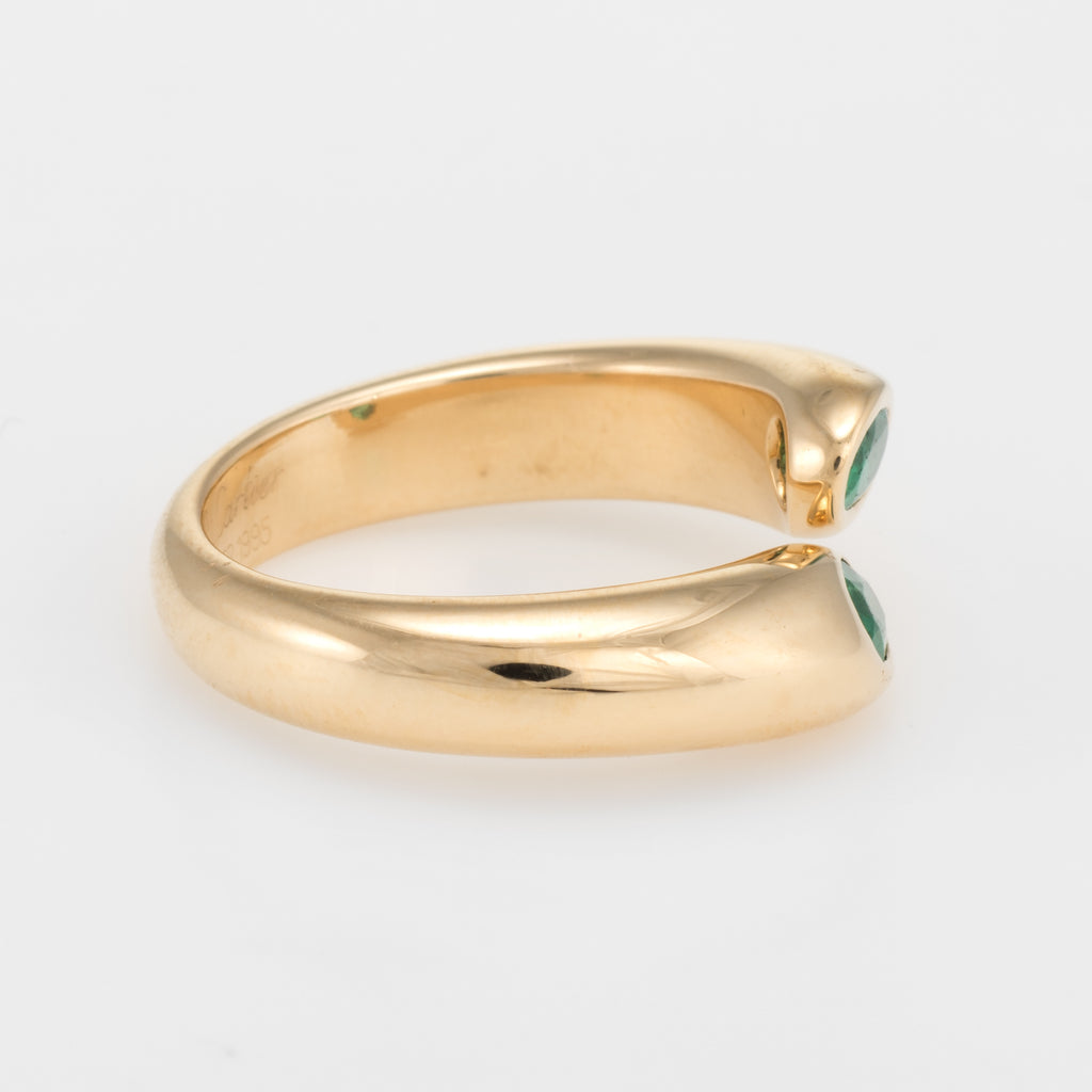 Finely detailed Cartier Ellipse ring, crafted in 18 karat yellow gold. Emeralds measure 4.25mm x 2.75mm and total an estimated 0.40 carats. The emeralds are in excellent condition and free of cracks or chips. The ring is circa 1995 and in excellent condition. Weight: 8.7 grams. Size: 5 1/4. Can be resized. The ring is hallmarked "750" for 18 karat gold, "Cartier", the ring size "50", the year "1995" and the serial number.