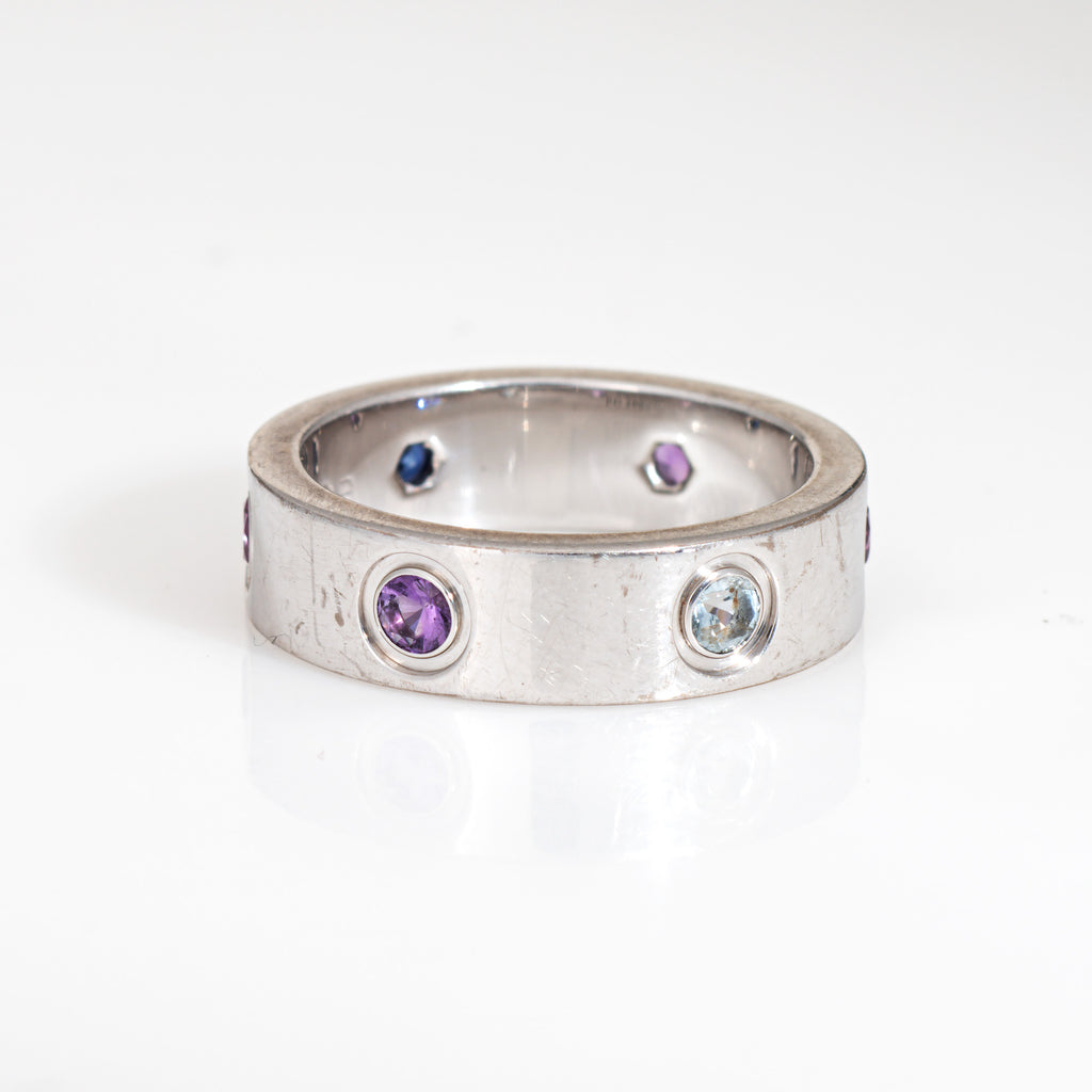 Purple spinel, aquamarine, pink & blue sapphire and amethyst measuring approx. 3mm are set into the band. Note: few minor surface abrasions to the gemstone visible under a 10x loupe.