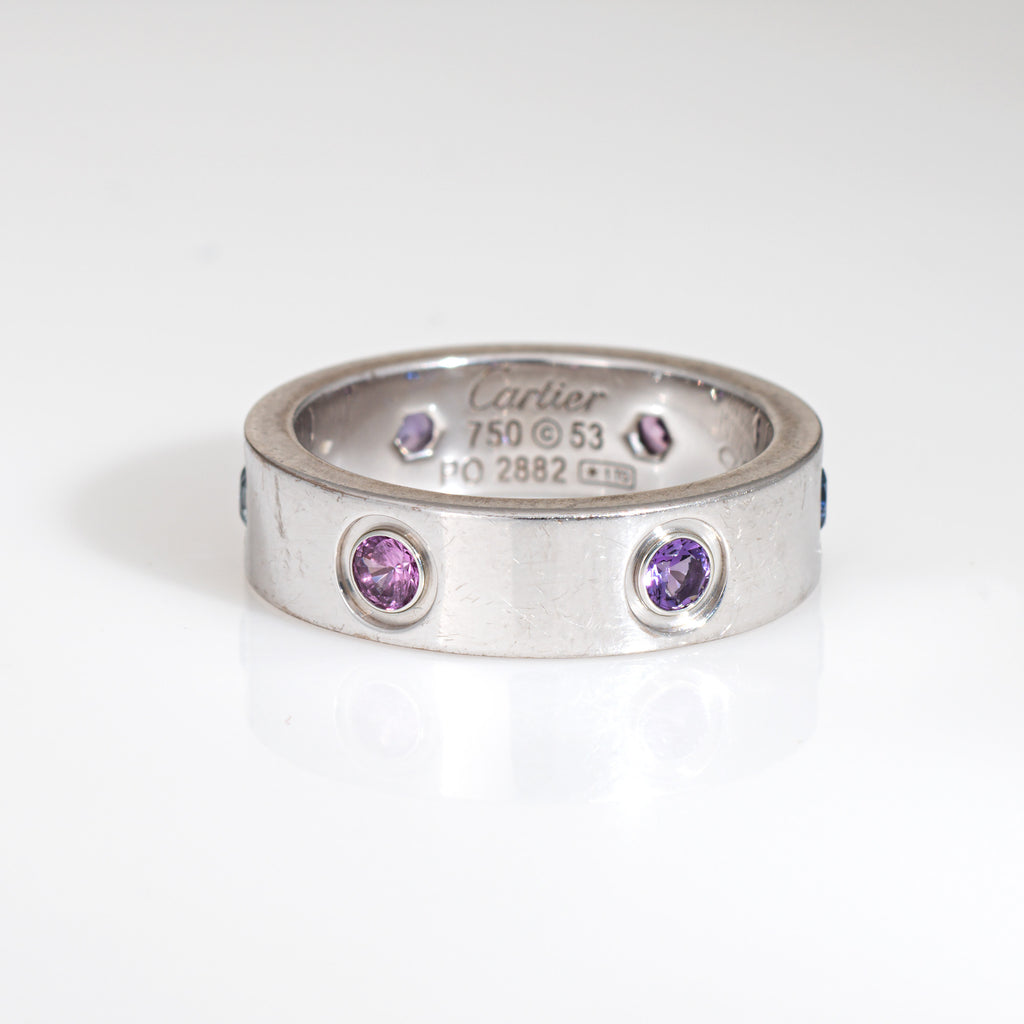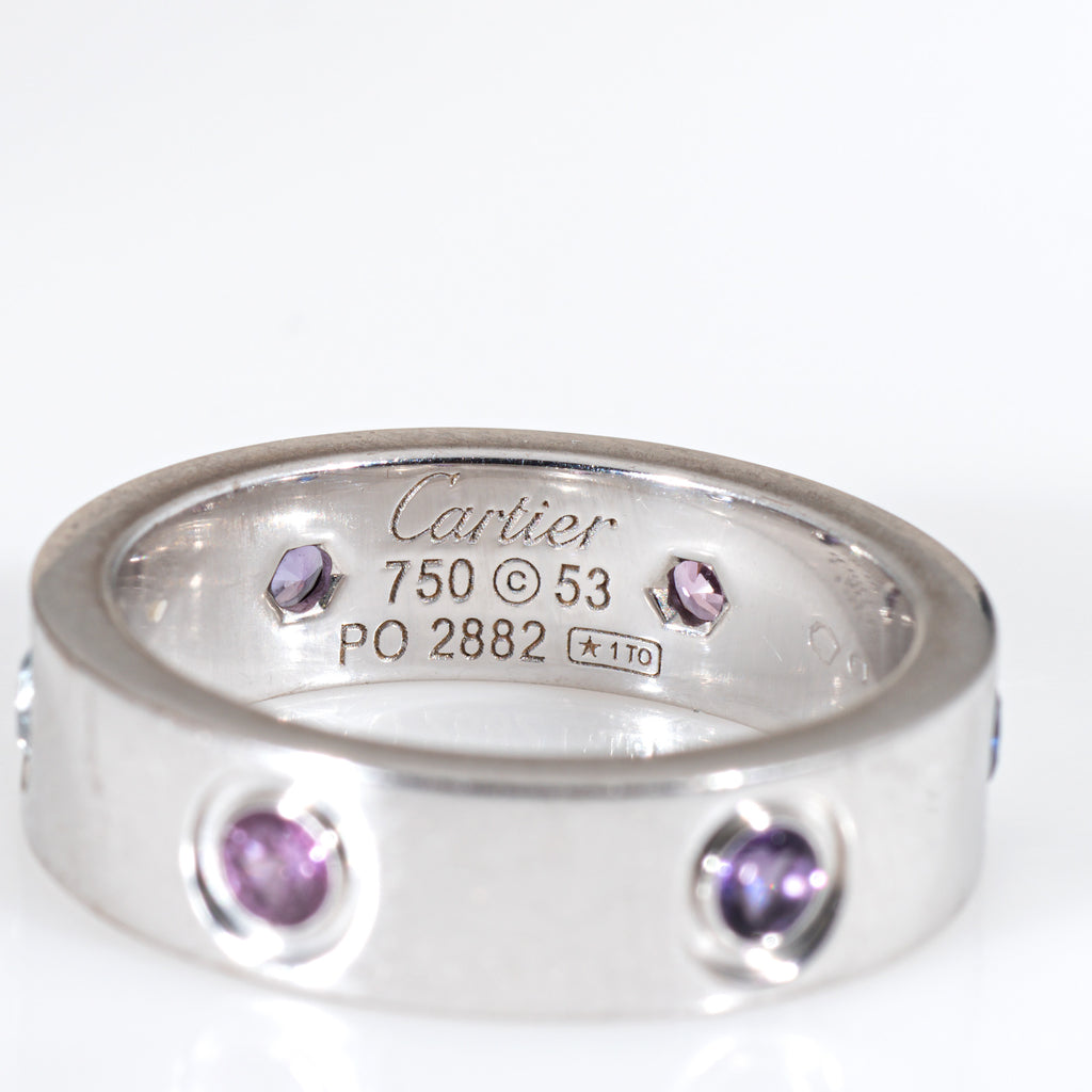 Pre-owned Cartier gemstone Love ring crafted in 18k white gold.