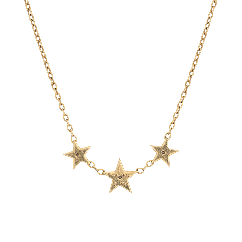 Diamonds adorn a graduated three-star motif. The necklace measures 16 inches in length and sits nicely at the nape of the neck. Great worn alone as a statement piece or layered.