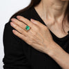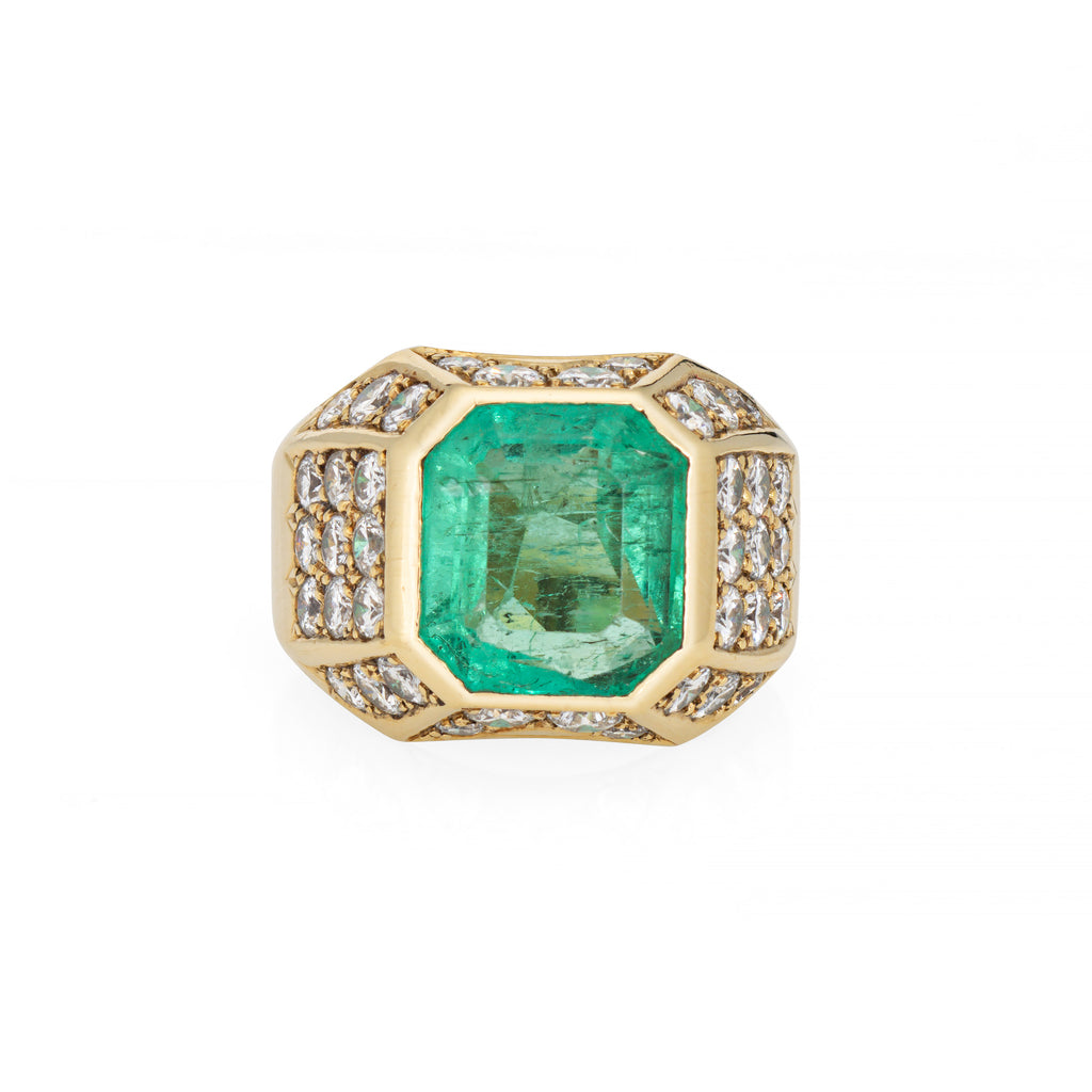 The vibrant emerald weighs an impressive estimated 6.05 carats, bezel set in a square mount. The design gives the stunning gemstone maximum presence and impact on the hand. The vivid green hue is captivating, showcasing the vibrancy that makes Colombian emeralds some of the most desirable gemstones in the world. Known for their rich saturation the emerald lights up in natural sunlight. Diamonds accent the emerald adding sparkle and fire to the ring. The signet design is great for wear as an alternative gemstone engagement ring or right-hand ring for everyday wear. The medium rise ring (7mm - 0.27 inches) sits comfortably on the finger.