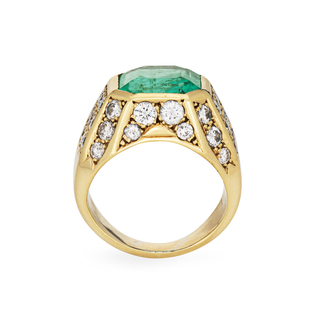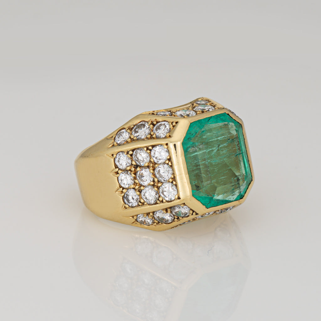 Stylish natural emerald & diamond ring (circa 1980s) crafted in 18k yellow gold.