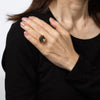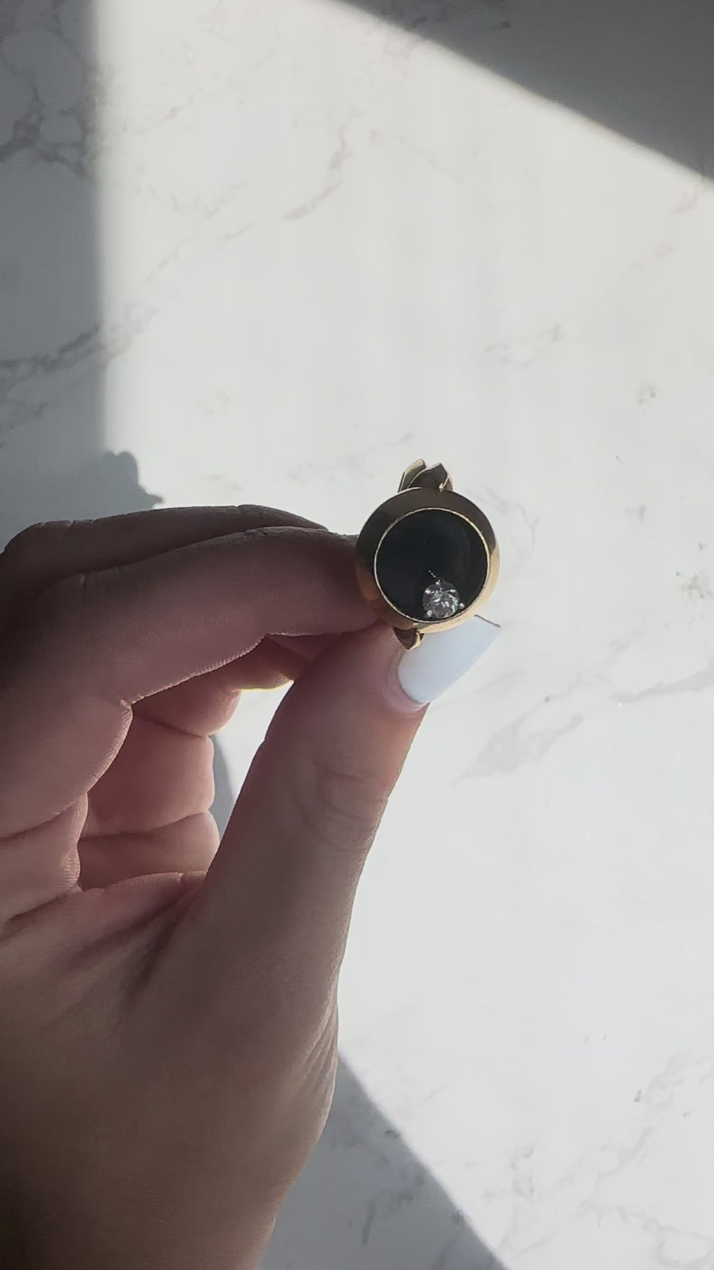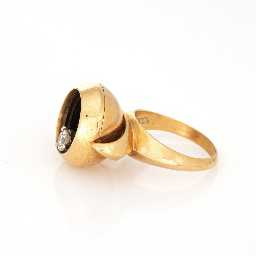 Angel Castelo was a Uruguayan‑born jeweler who built a unique niche in Beverly Hills jewelry design in the 1960s to 1970s. His kinetic rings, particularly exemplified in the mid‑1970s, stand out as his most famous and creatively realized work. The diamond is mounted on a rotating black backdrop that allows for subtle motion with your every movement. The ring has a medium rise on the finger (12mm - 0.47 inches) and sits comfortably on the hand. A great collector's piece and very wearable too!