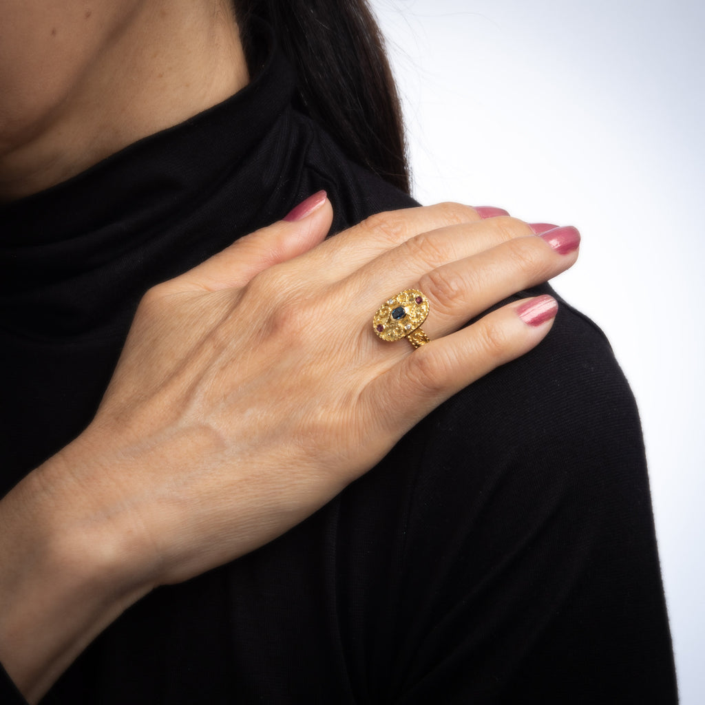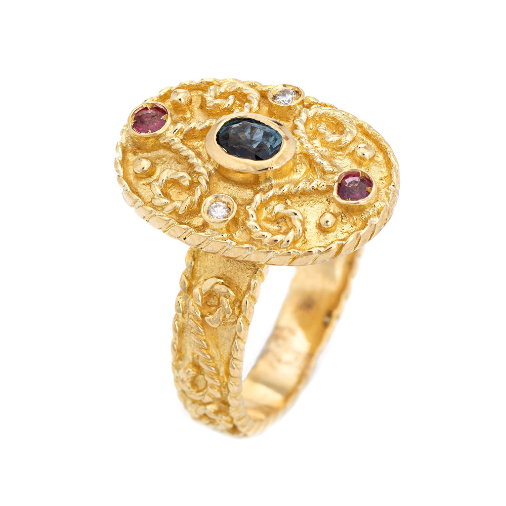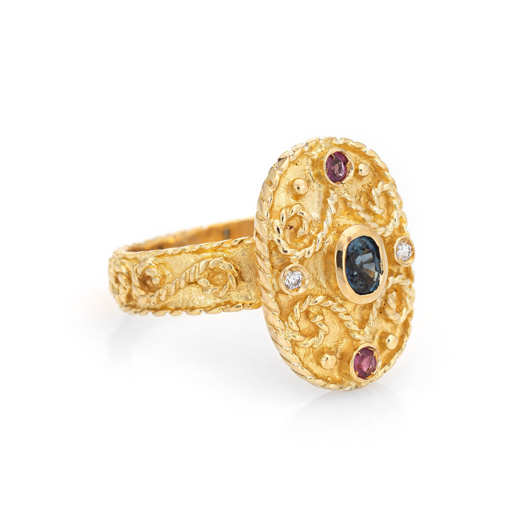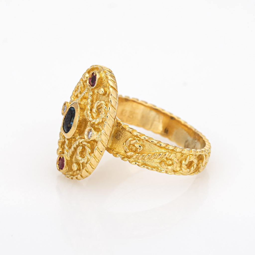 The ring features an elaborate Etruscan style design. The gemstones add color and contract to the oval mount. The low rise ring (6mm - 0.23 inches) sits comfortably on the finger. Great for day or evening wear.