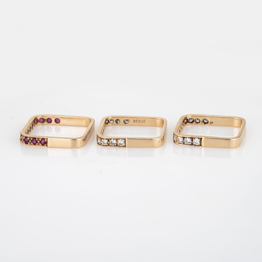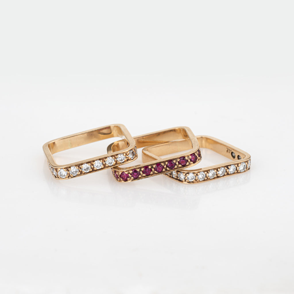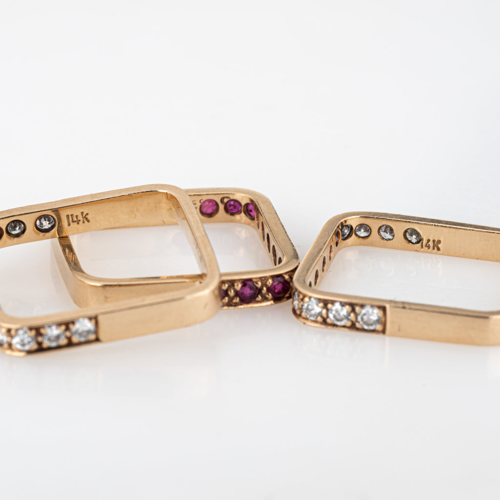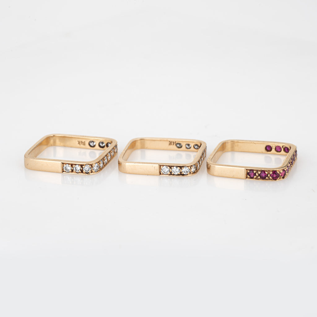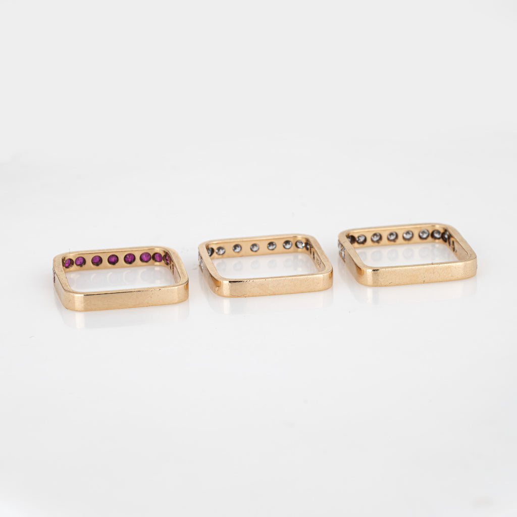 Set of 3 Square Stacking Rings 6.5 Estate 14k Yellow Gold Diamond Ruby Jewelry