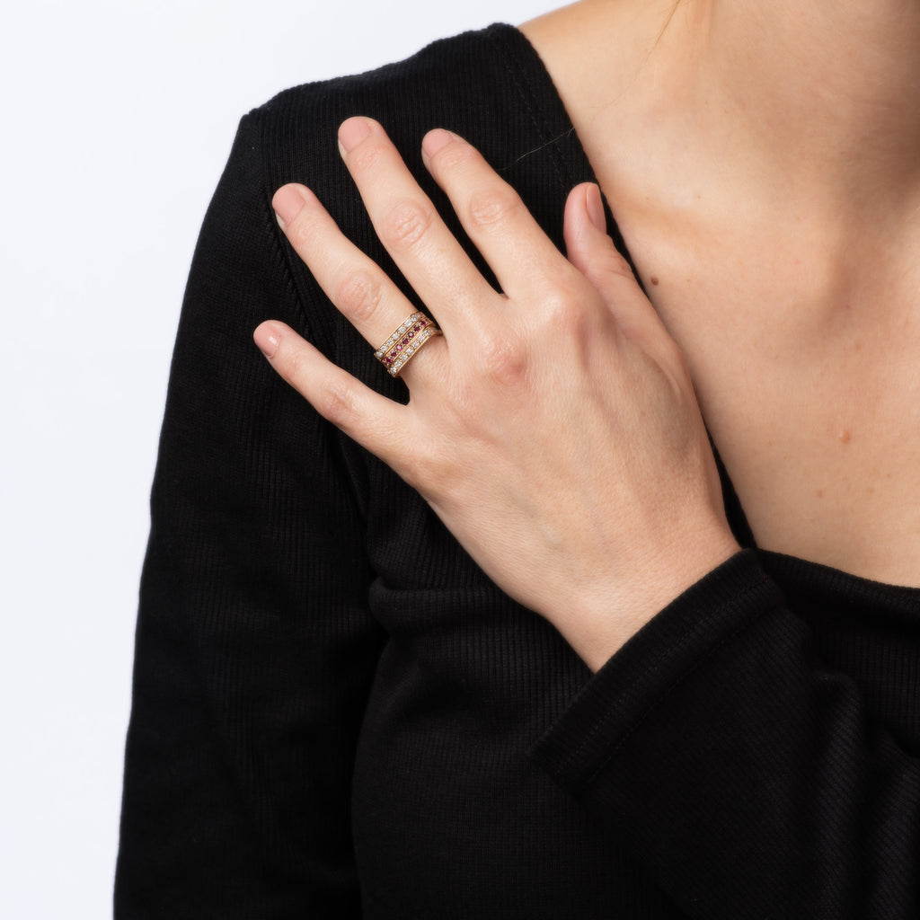 Stones: Round brilliant cut diamonds total an estimated 0.50 carats (approx. 0.25 carats per band). The diamonds are estimated at H-I color and VS2-SI2 clarity). Rubies total an estimated 0.25 carats.