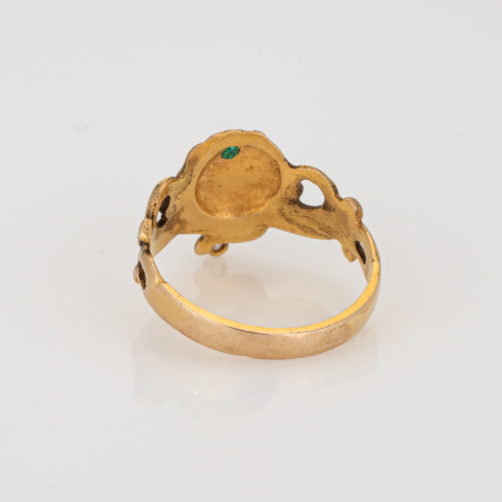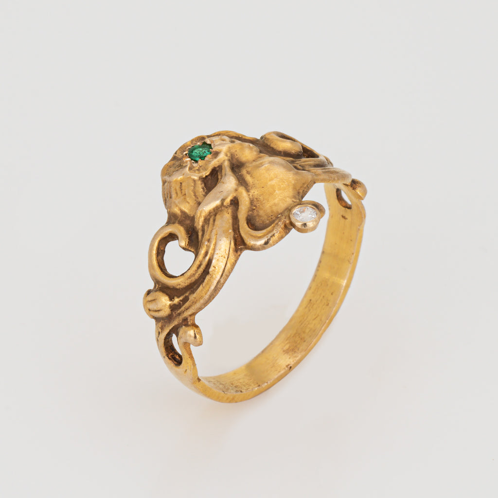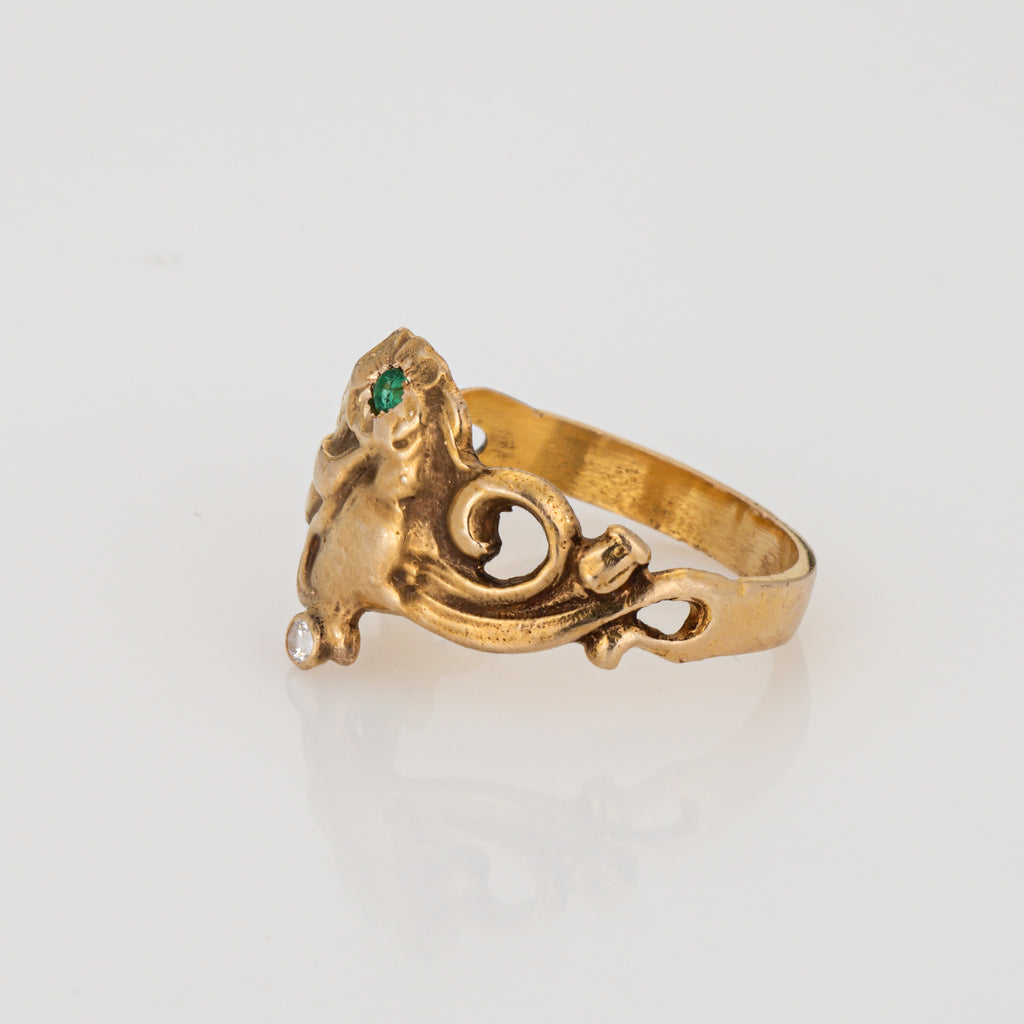Stylish vintage Art Nouveau style emerald & diamond ring crafted in 14 karat yellow gold (10k yellow gold band).