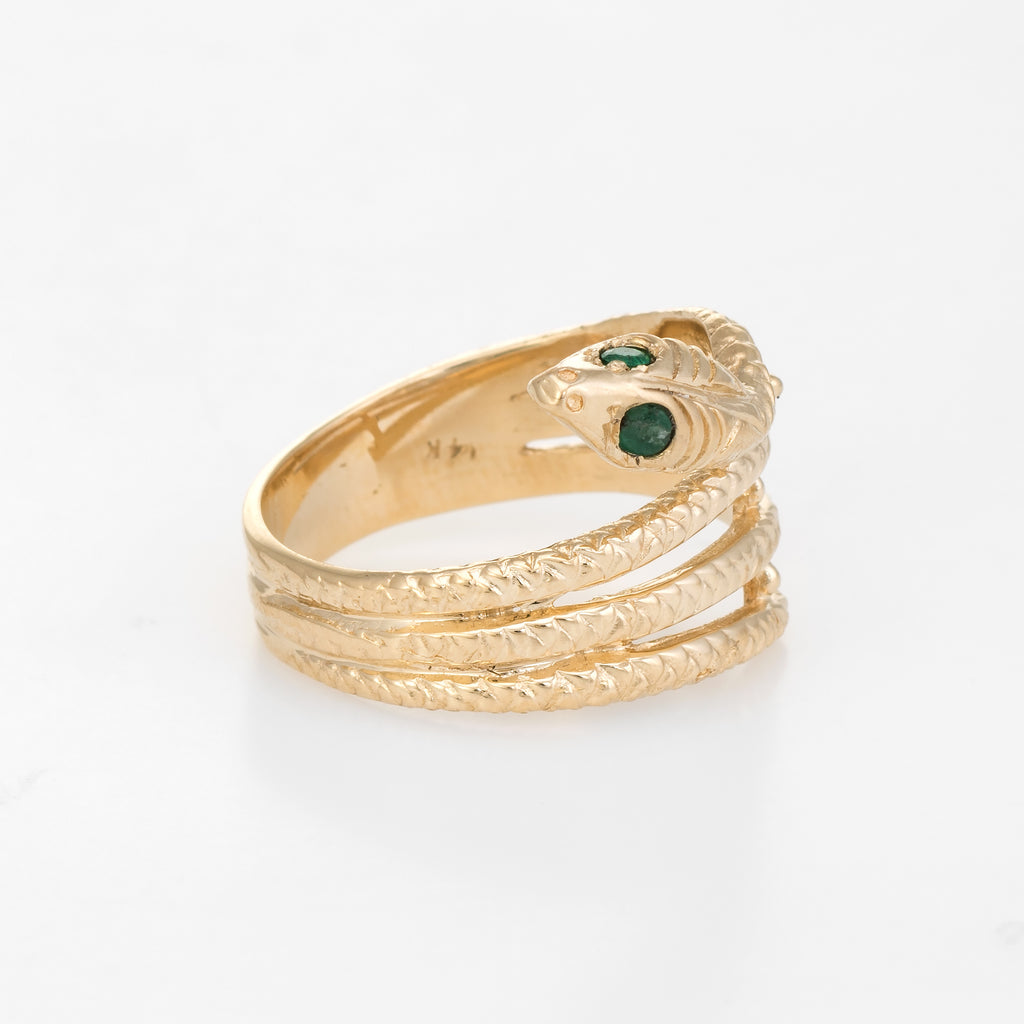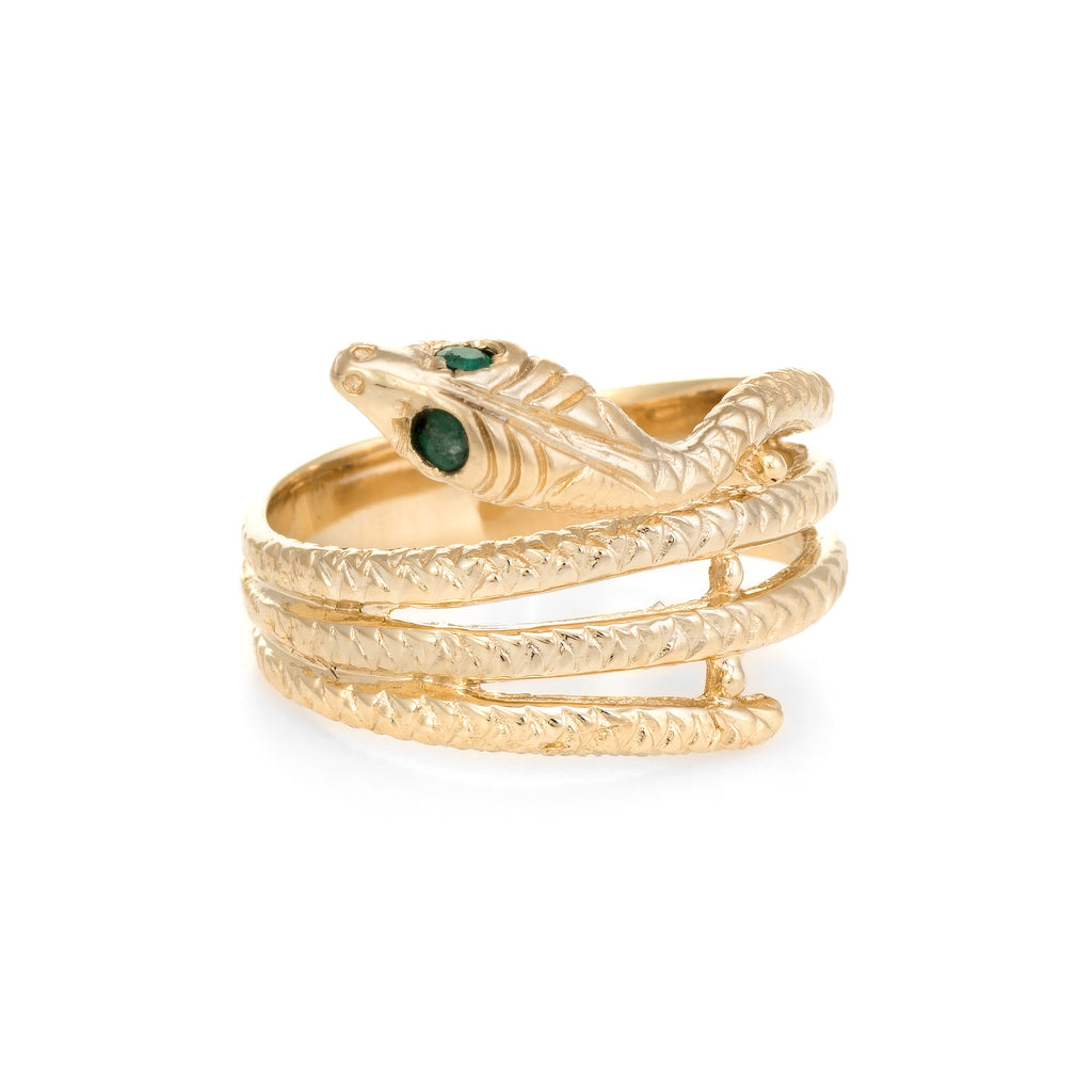 For centuries the snake has represented eternal love and faithfulness. The ring is great for stacking (looks great worn on the pointer finger), alone or with your other vintage pieces. As an alternative engagement or wedding band the ring really makes a statement and stands out on its own. The snake scrolls around the band three times with a thick band (5mm) and a nice medium to lightweight feel on the finger (6.1 grams). The scale like detail to the snake adds depth and a lifelike feel to the ring.