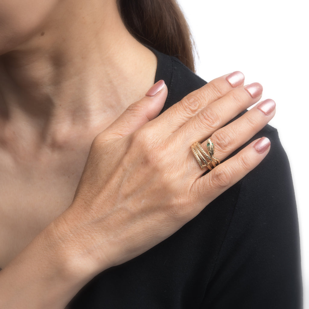 Stones: Two estimated 0.01 carat emeralds adorn the snakes eyes (total estimated weight of 0.02 carats).