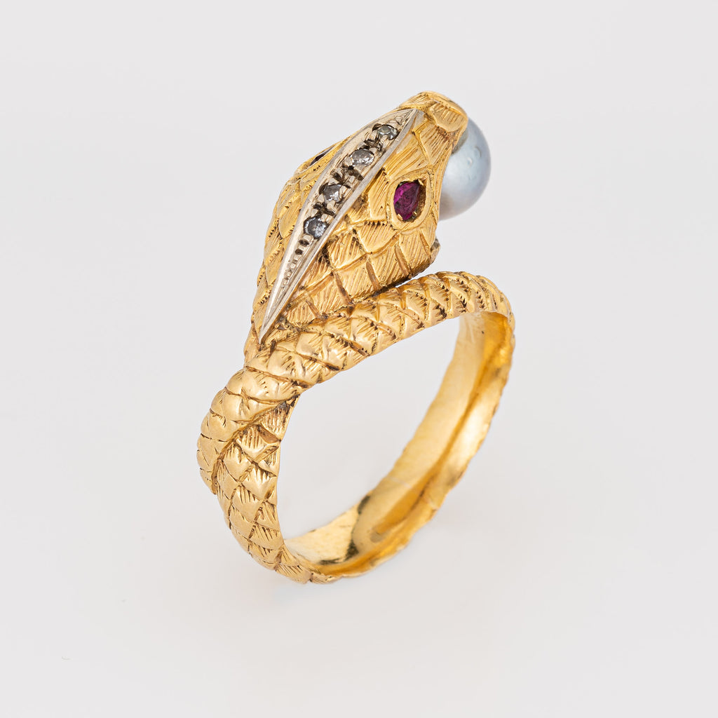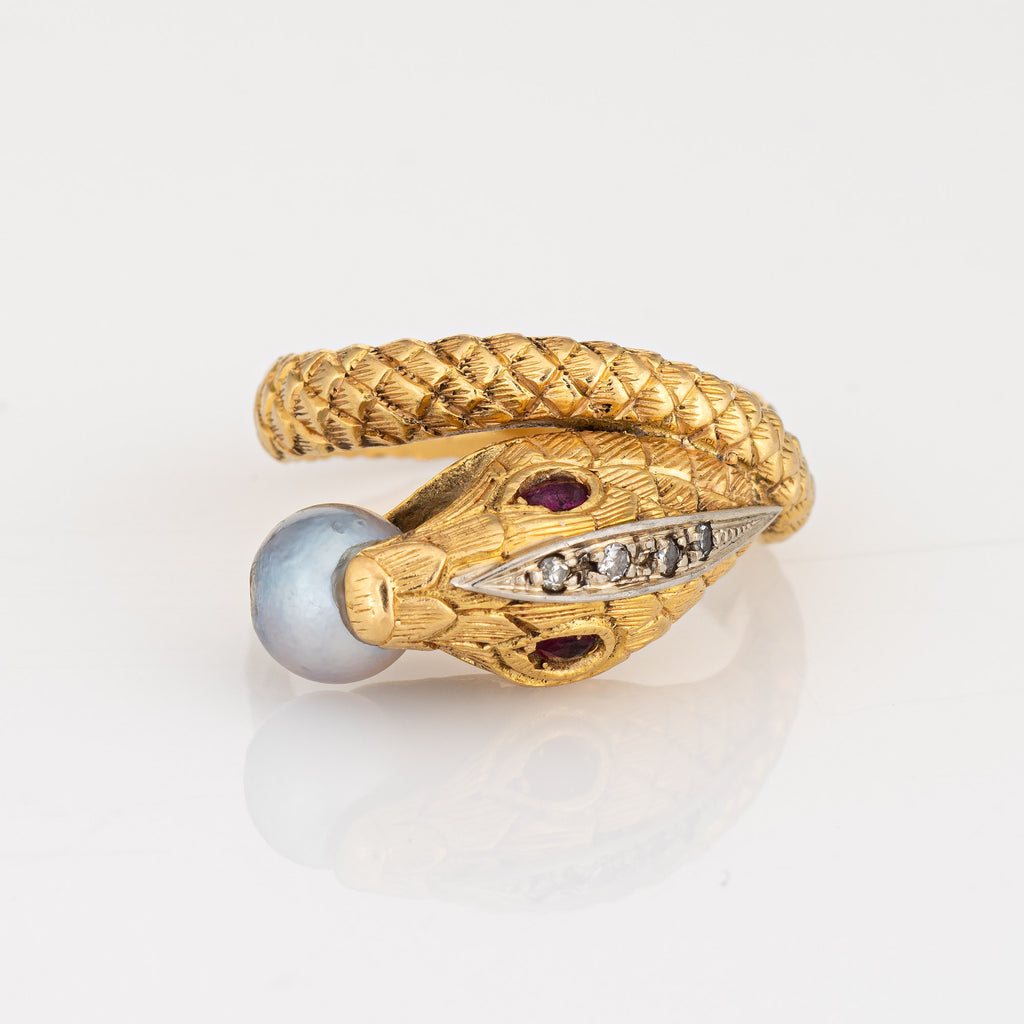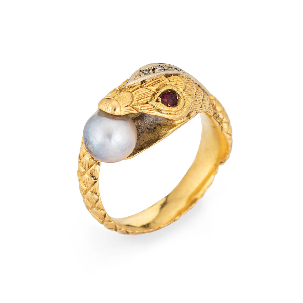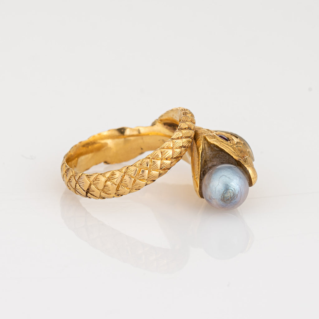 Finely detailed vintage pearl & ruby snake ring, crafted in 19 karat yellow gold.