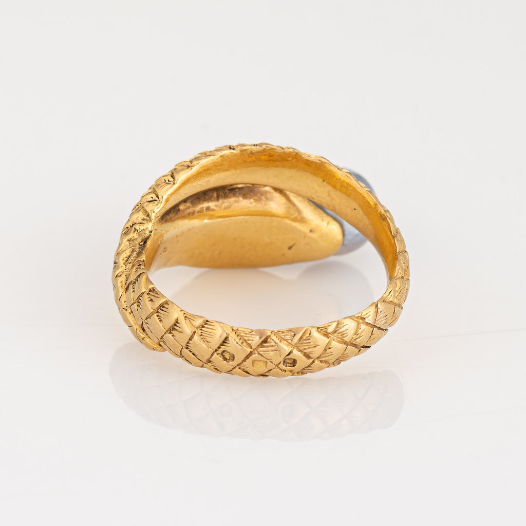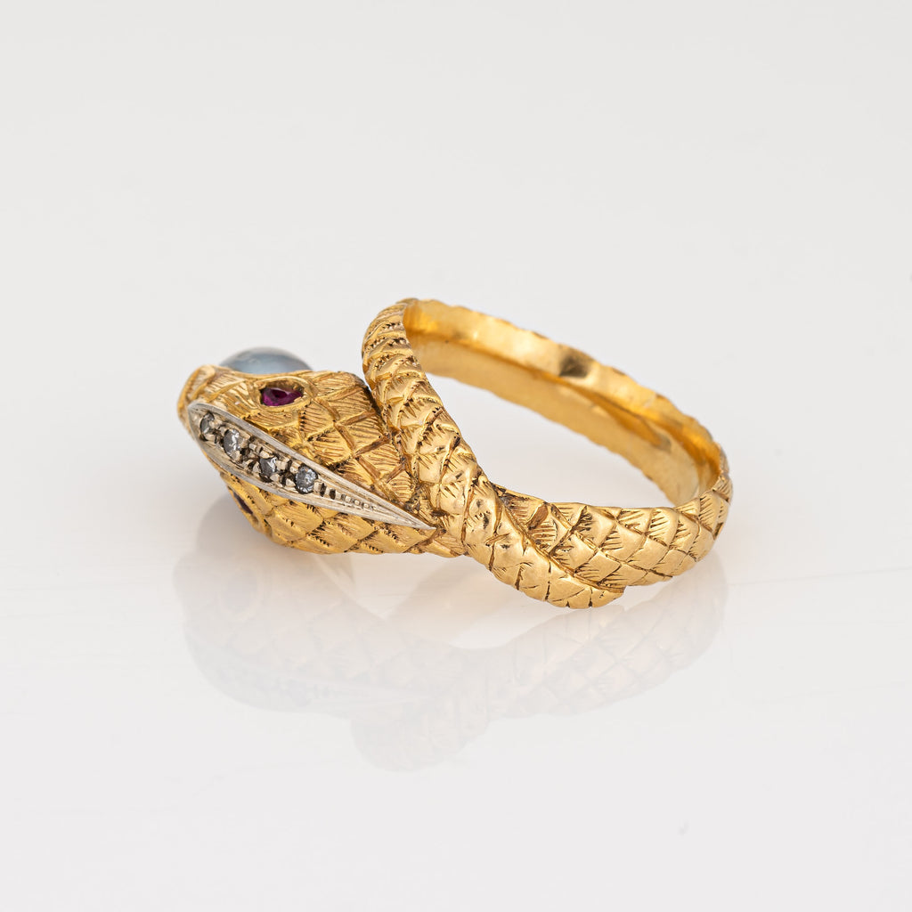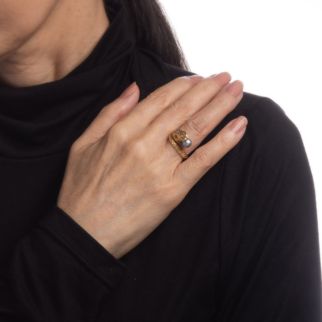 For centuries the snake has represented eternal love and faithfulness. The elaborate snake features lifelike scale detailing with ruby set eyes and a pearl to the mount. The ring is great worn alone or layered with your fine jewelry from any era.
