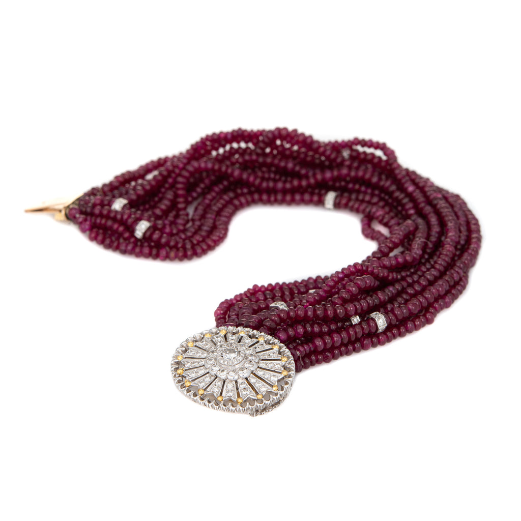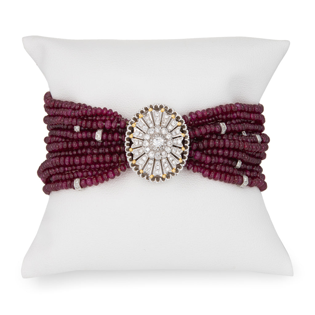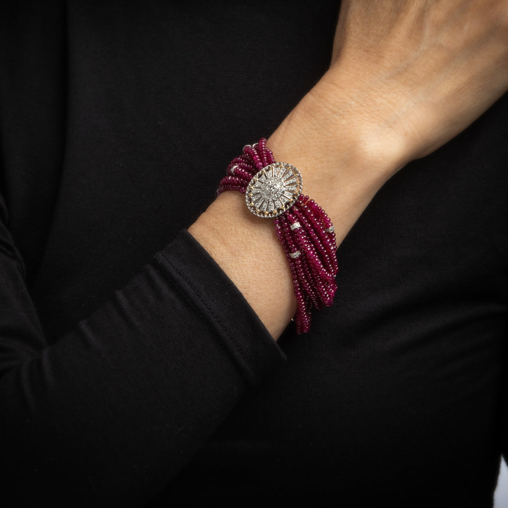 The bracelet makes a great statement on the wrist. The rich red ruby beads are strung onto 14 strands. Diamond set rondelles add texture and visual interest to the bracelet. The oval shaped diamond set clasp features a secure slip lock closure. Ideal worn alone or layered with your fine jewelry from any era.