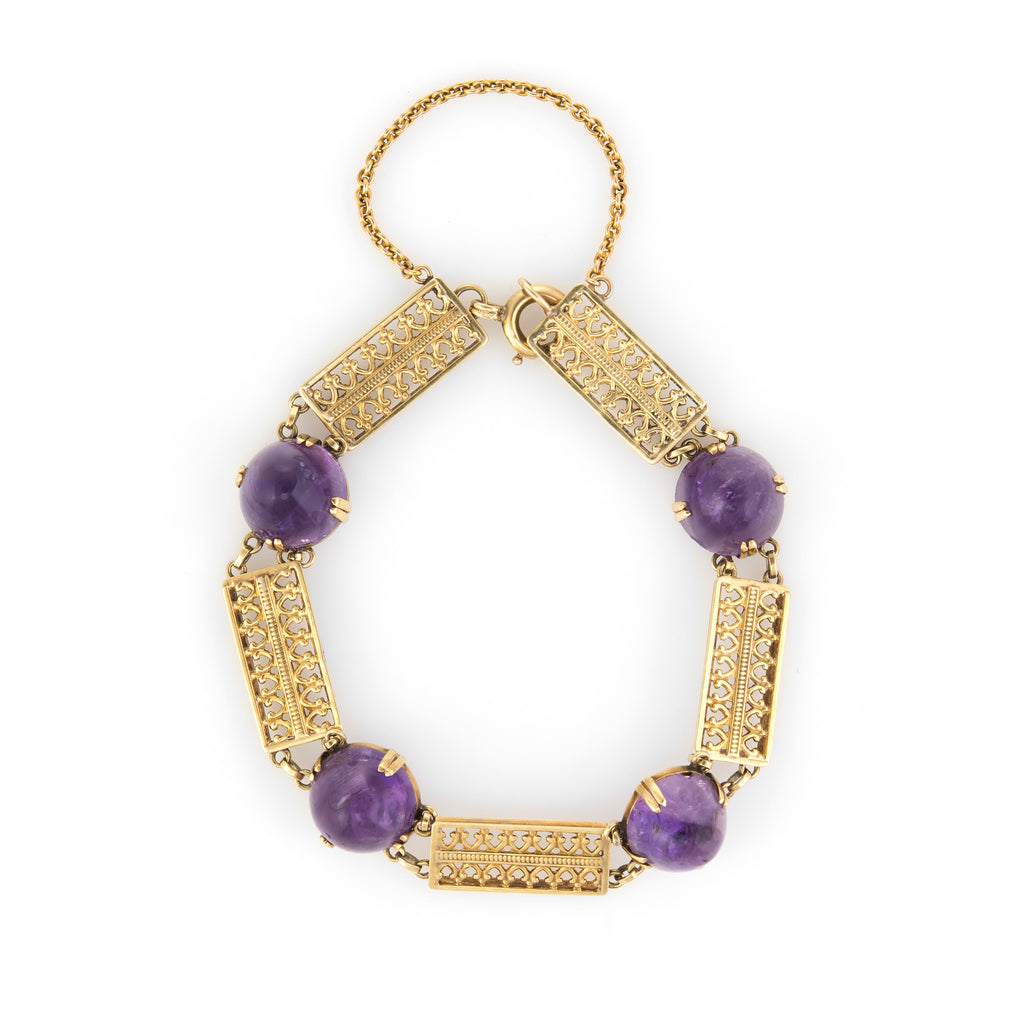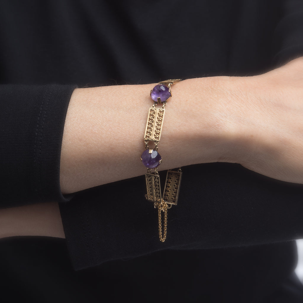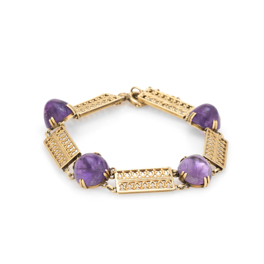 The rectangular links feature an intricate trefoil design with the sugarloaf amethysts set securely in double four pronged mounts. The bracelet is great worn alone or layered with your fine jewelry from any era.