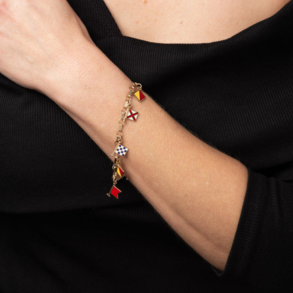 The nautical themed enameled bracelet features 9 enameled nautical flags. The flags represent a dual purpose with the first letter of each flag spelling out the word "Bon Voyage". Each of the flags are still used today as a form of communication on vessels (and also used long before radio communication came into use). The flags depicted in the bracelet are: