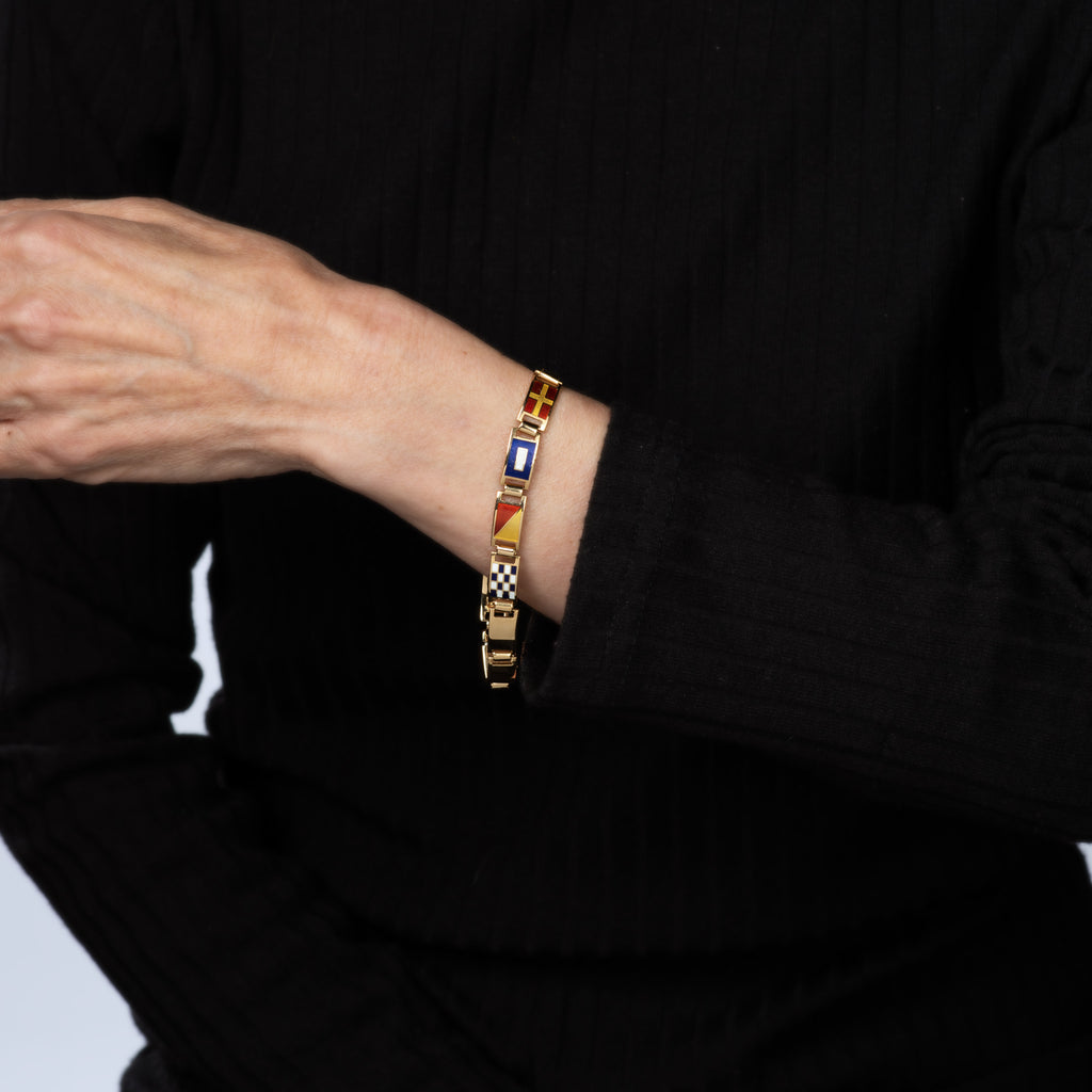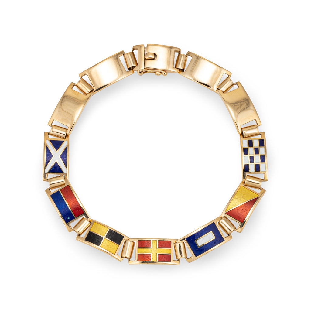 The nautical themed enameled bracelet features 7 enameled nautical flags. Each of the flags are still used today as a form of communication on vessels (and also used long before radio communication came into use). The flags depicted in the bracelet are: