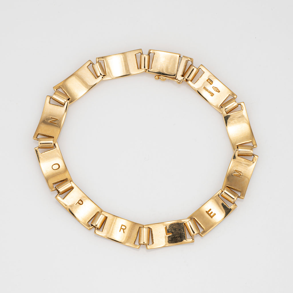 The bracelet is made by the Italian jewelry company 'Scarabeo' who produced nautical themed jewelry from the late 1960s through the 1980s with the explosion of yacht ownership and Mediterranean leisure culture at the time. The first letter of each nautical flag is engraved on the back of the bracelet. The bracelet is in very good condition and was lightly cleaned and polished.